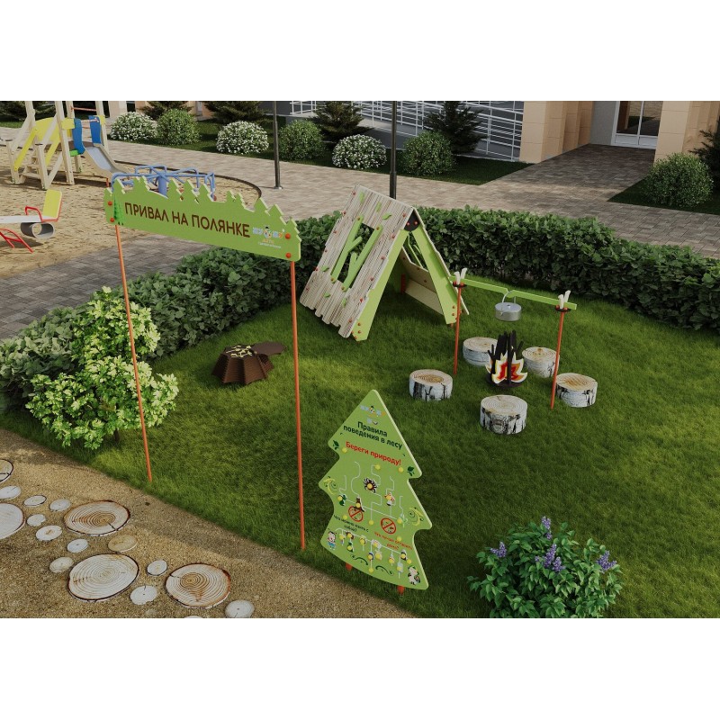 24. Экоплощадка "Жу-Жу": интерактивная композиция "Котелок на стойках и костер" - сюжетный элемент, развивающий воображение и обучающий безопасному обращению с огнём.