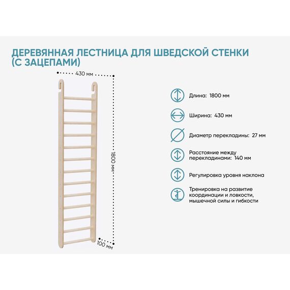 Деревянная лестница для шведской стенки (с зацепами) [А681]