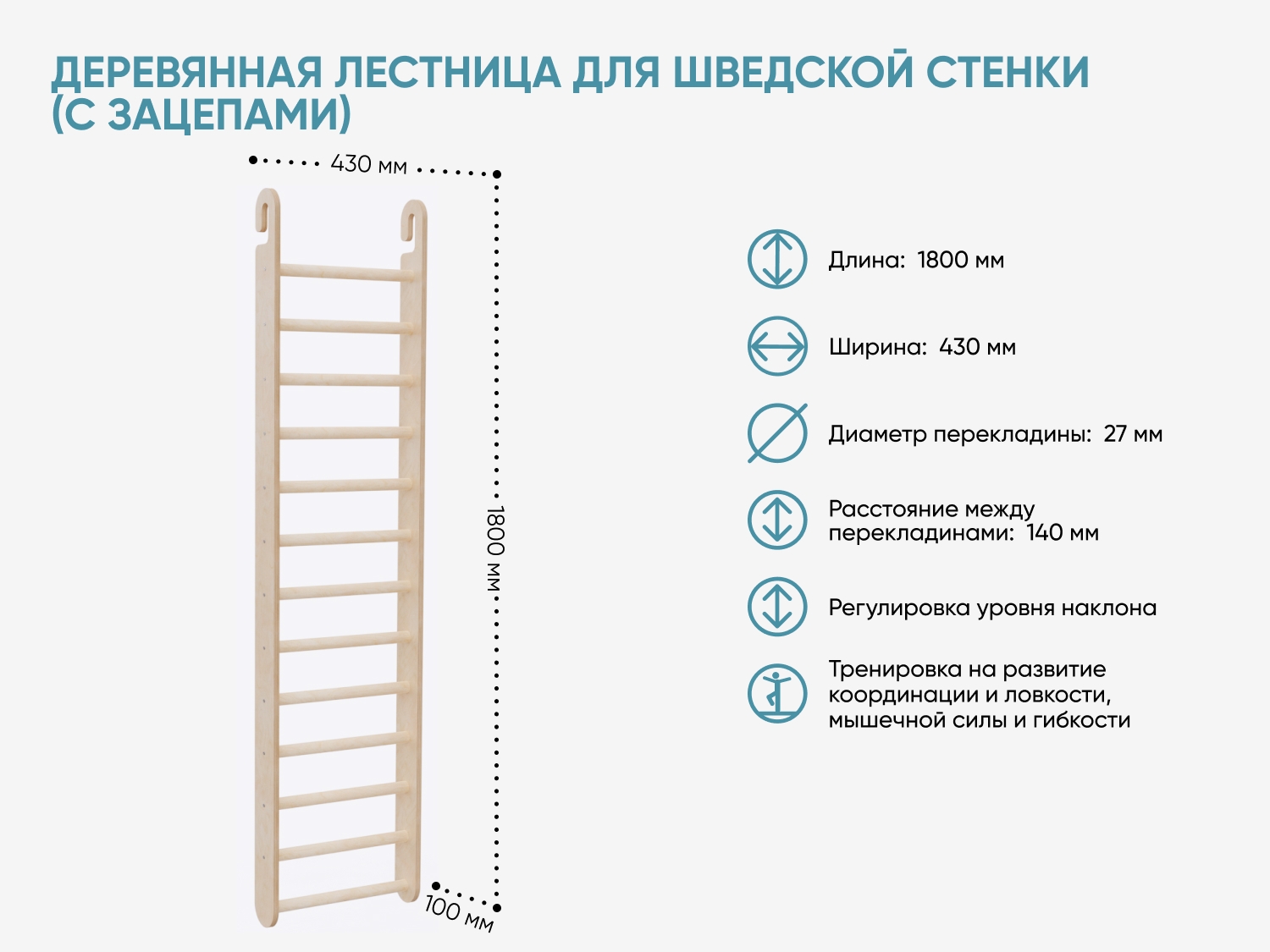 Деревянная лестница для шведской стенки (с зацепами) [А681]