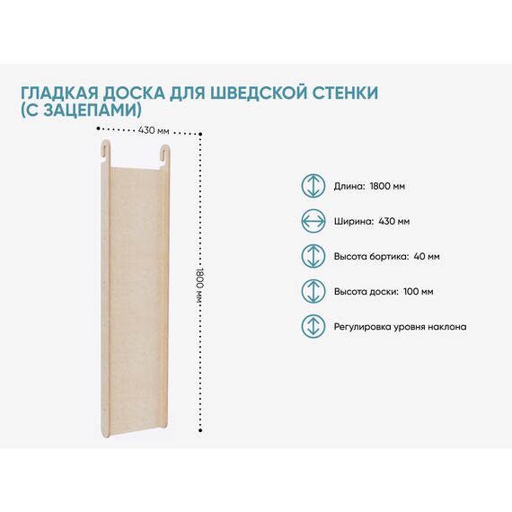Доска гладкая предназначена для выполнения различных гимнастических упражнений на занятиях в детских учреждениях. Крепится на гимнастическую стенку при помощи крючков-зацепов, они же позволяют менять угол наклона доски для регулировки нагрузки.