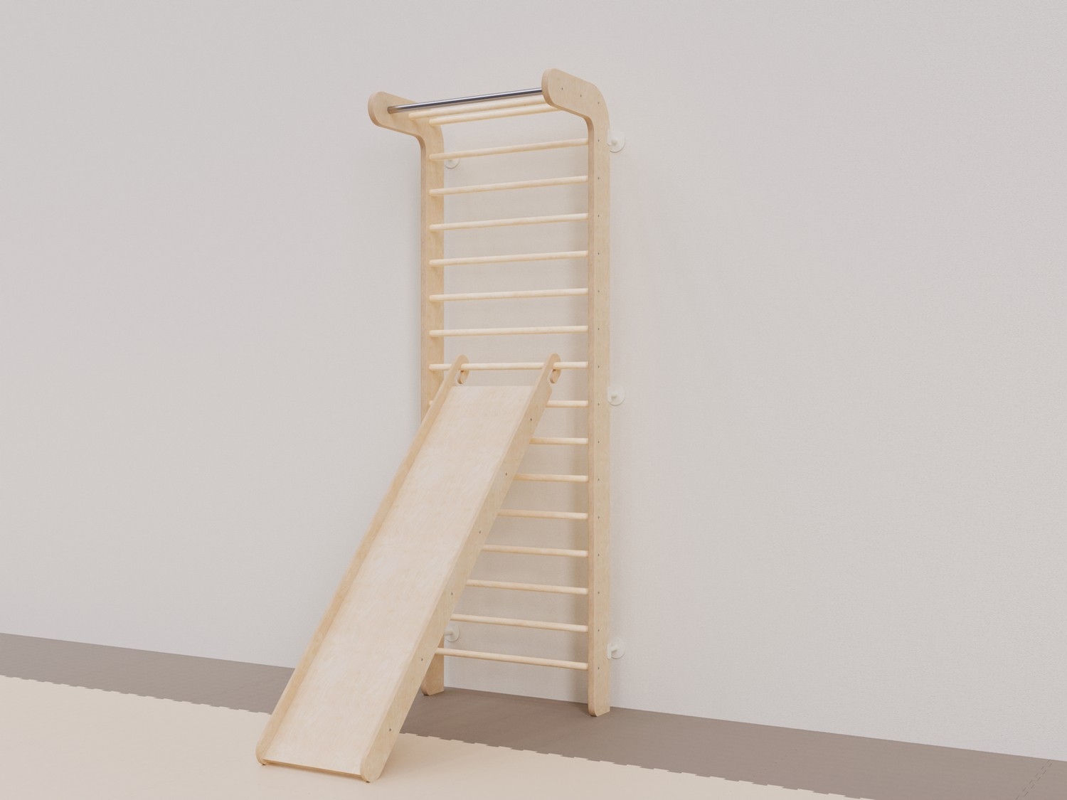 Это один из снарядов, которые используются с раннего возраста: уже годовалых детей с поддержкой учат ходить вверх и вниз по наклонной доске, приподнятой на 10-20 см. Предварительным шагом является обучение движениям на ограниченной поверхности: доску располагают на полу, чтобы ребенок по ней ходил и ползал. Для этого ставят на другой край доски привлекательный для ребенка предмет.