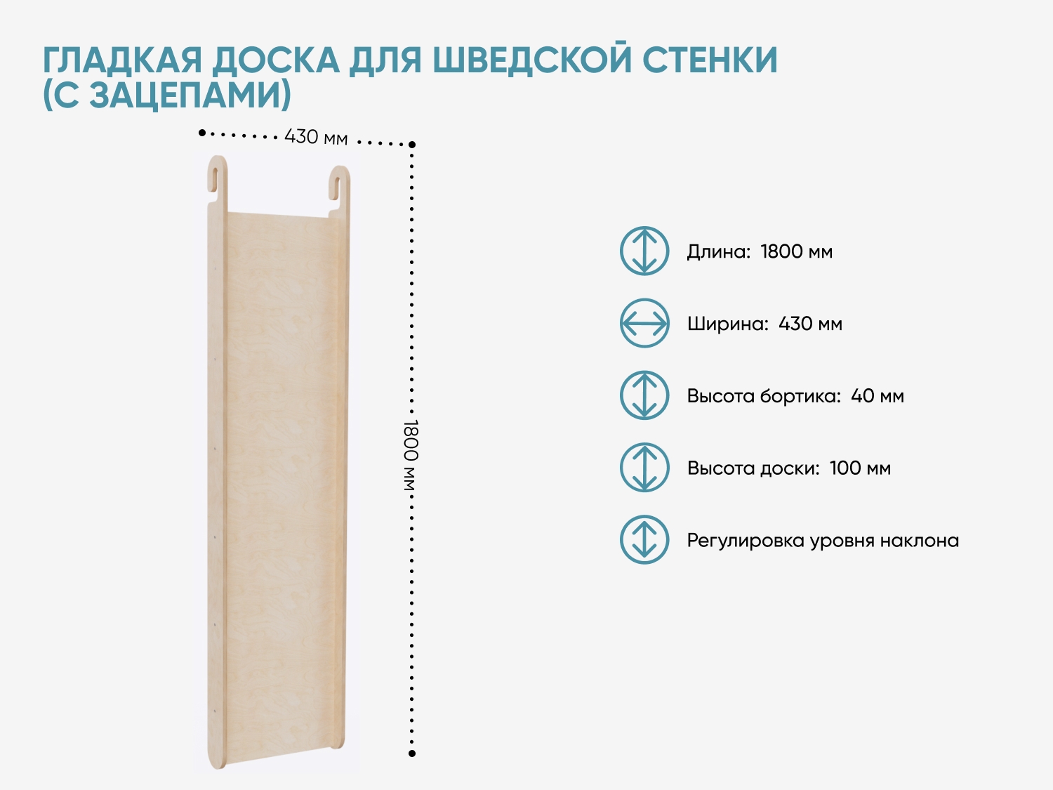 Доска гладкая предназначена для выполнения различных гимнастических упражнений на занятиях в детских учреждениях. Крепится на гимнастическую стенку при помощи крючков-зацепов, они же позволяют менять угол наклона доски для регулировки нагрузки.