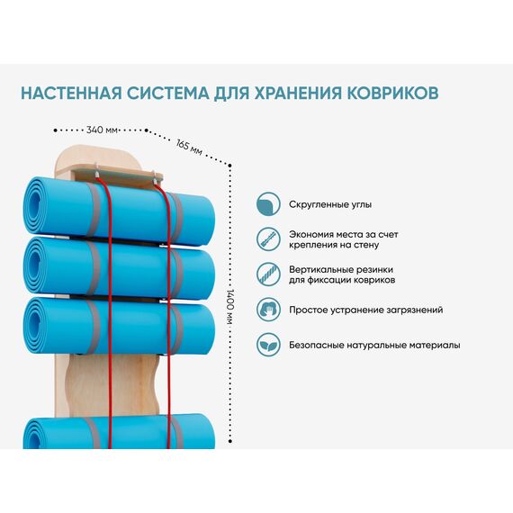 Система для хранения гимнастических ковриков. Экономит место в физкультурном зале, расширяет рабочее пространство на полу за счет крепления к стене. Вертикальные резинки позволяют с легкостью доставать коврики и убирать их обратно.