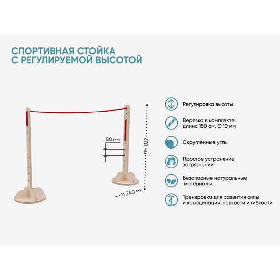 Стойка выполнена из высококачественных и прочных материалов, безопасных для использования детьми. Соответствует актуальным ГОСТам на детскую мебель и инвентарь для спортивных залов, требованиям СанПиН и пожарной безопасности, рекомендациям ФОП ДО по созданию развивающей среды для детей. Гладкие поверхности просты в уходе: достаточно влажной уборки для поддержания высокого уровня гигиены.