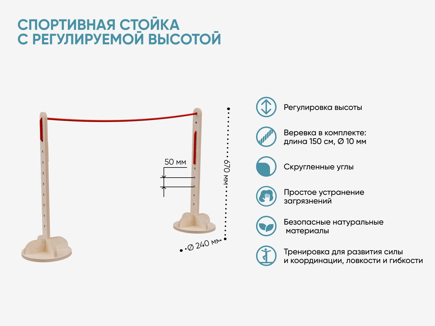 Размер Высота: 670 мм Диаметр основания: 240 мм Между отверстиями 50 мм Диаметр веревки: 10 мм Длина веревки: 1500 мм