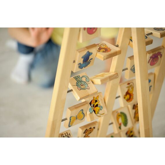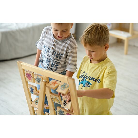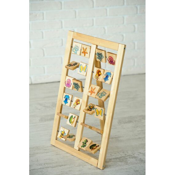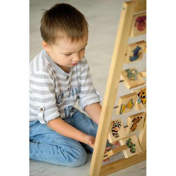 - Большая панель состоит из деревянной рамы, разделенной на две стороны, и 6 металлических перекладин, на которых закреплены деревянные квадратные дощечки, каждая сторона которых содержит от 2 дощечки с картинками. Картинки изображают разнообразную флору и фауну, такие как: птицы, звери, насекомые, фрукты, ягоды и рыбы.