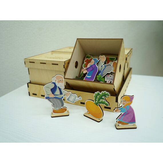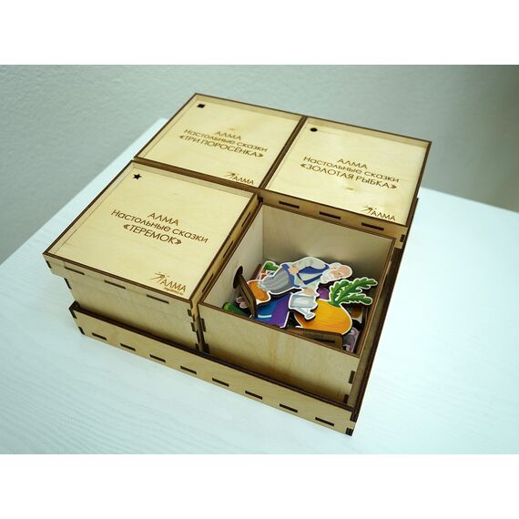 В наборе четыре коробки и подставка, обратная сторона которой является игровым полем. В каждой коробке лежат фигурки персонажей и атрибутов из соответствующей сказки. На крышке каждой коробки находится своя фигура, которая продублирована на подставке персонажей этой истории: данная система не позволит случайно перепутать героев и их сказки.