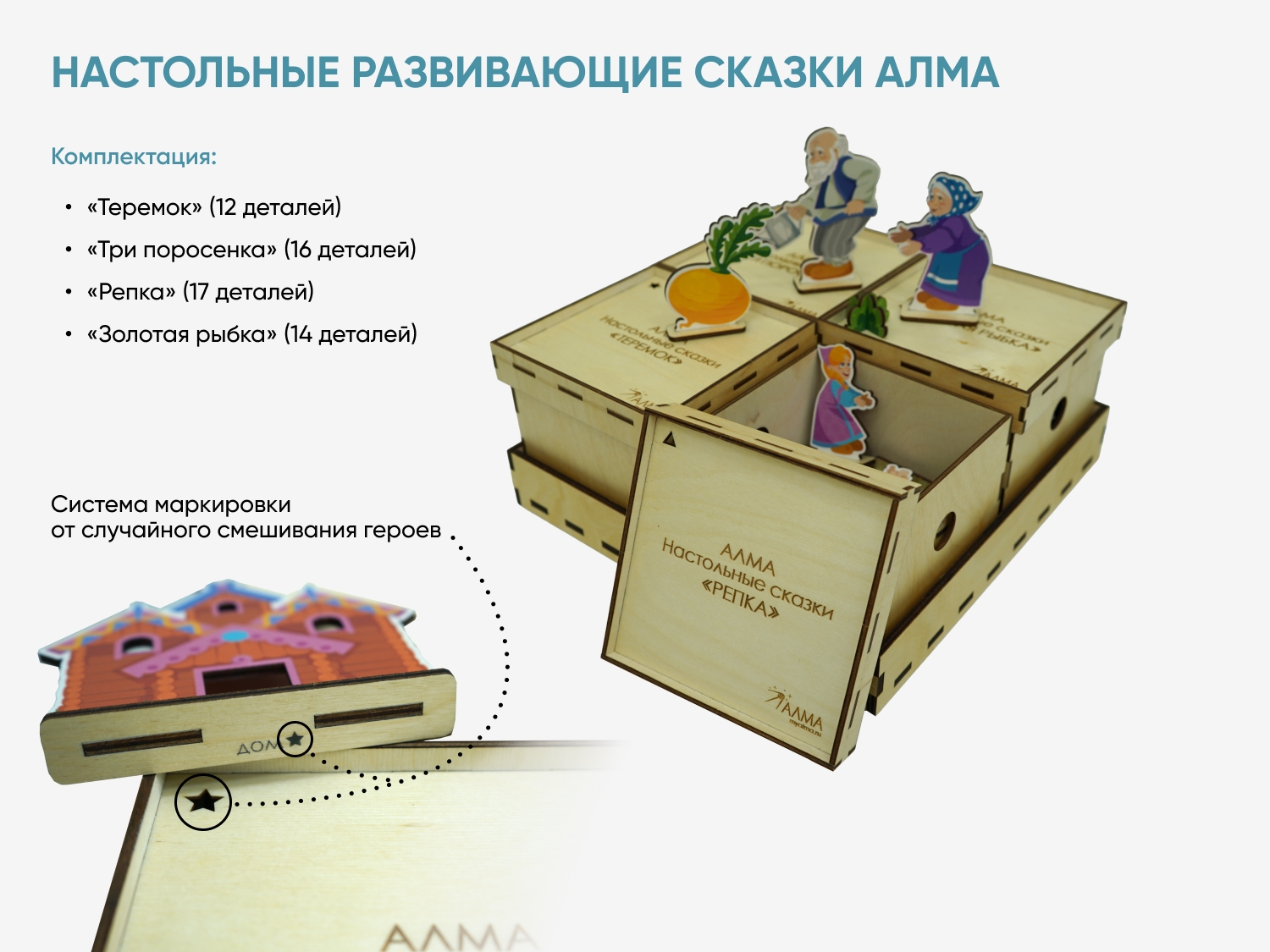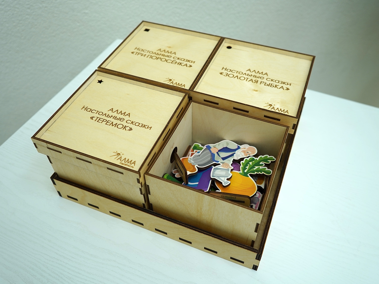 В наборе четыре коробки и подставка, обратная сторона которой является игровым полем. В каждой коробке лежат фигурки персонажей и атрибутов из соответствующей сказки. На крышке каждой коробки находится своя фигура, которая продублирована на подставке персонажей этой истории: данная система не позволит случайно перепутать героев и их сказки.