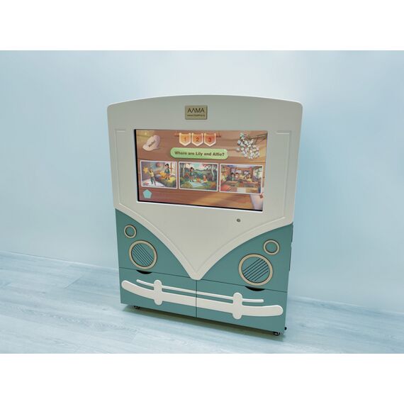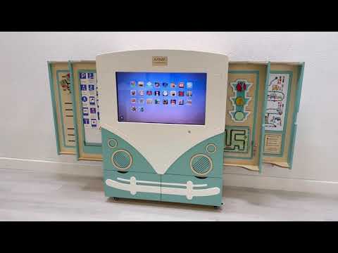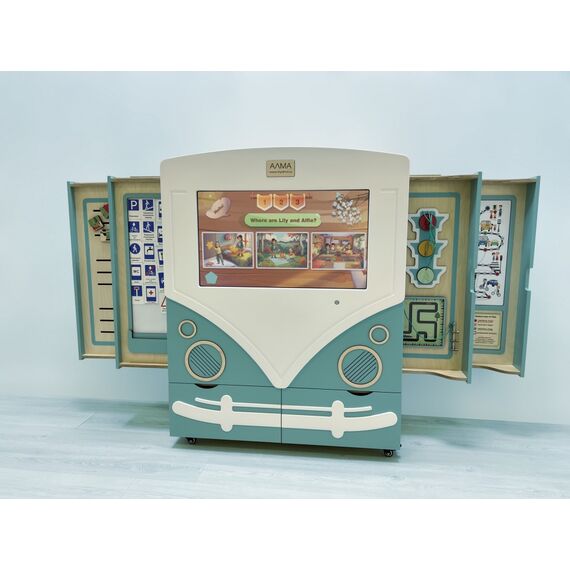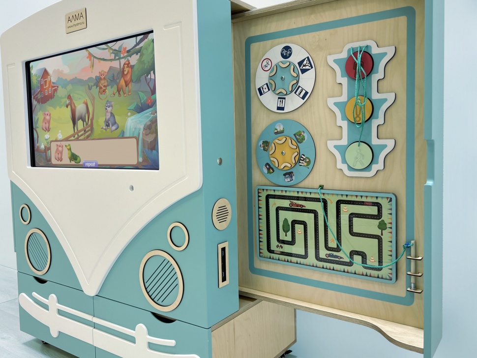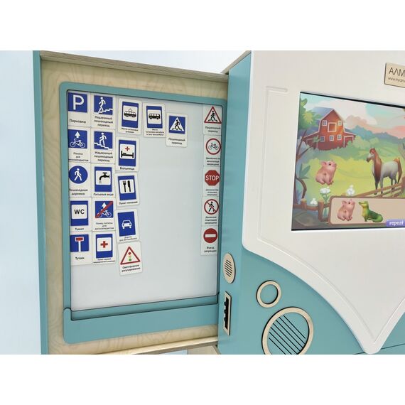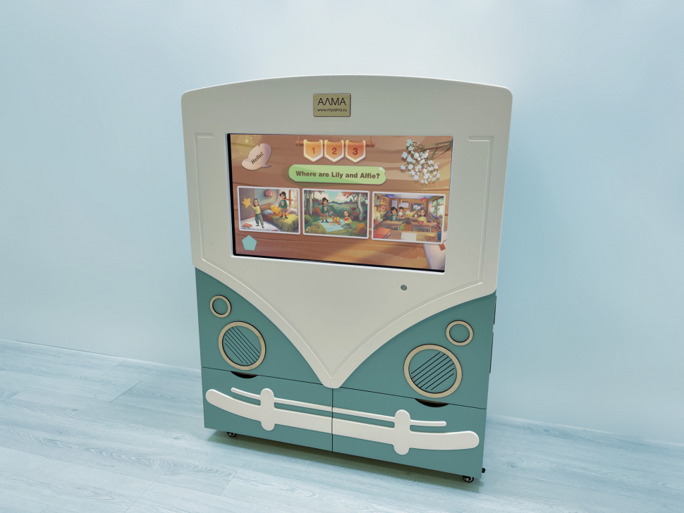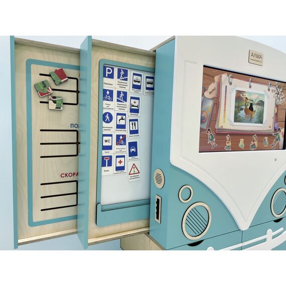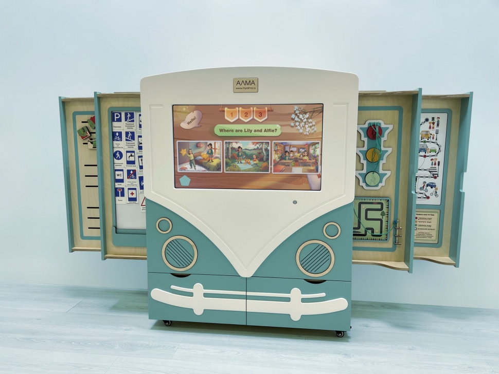 Лобовое стекло автобуса — это интерактивный сенсорный монитор диагональю 32 дюйма. На нём установлено программное обеспечение «АЛМА Дошкольное образование». Это более 300 образовательных игр на развитие логики, памяти, внимания, изучение окружающего мира, ПДД, устного счёта и английского языка.