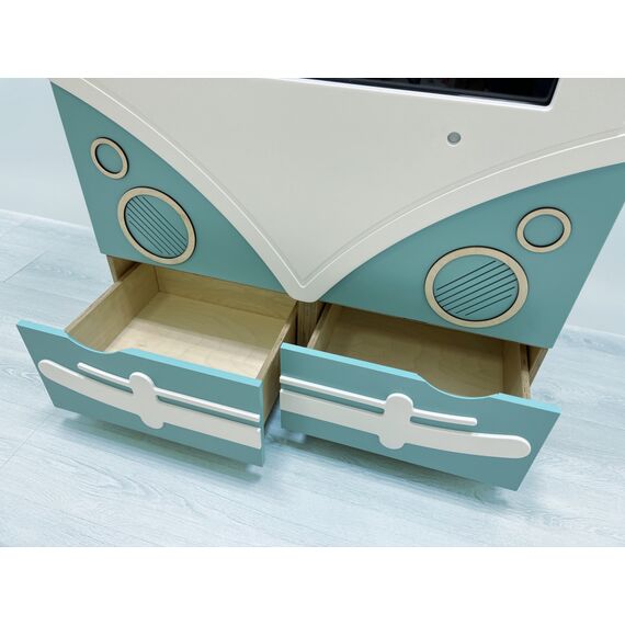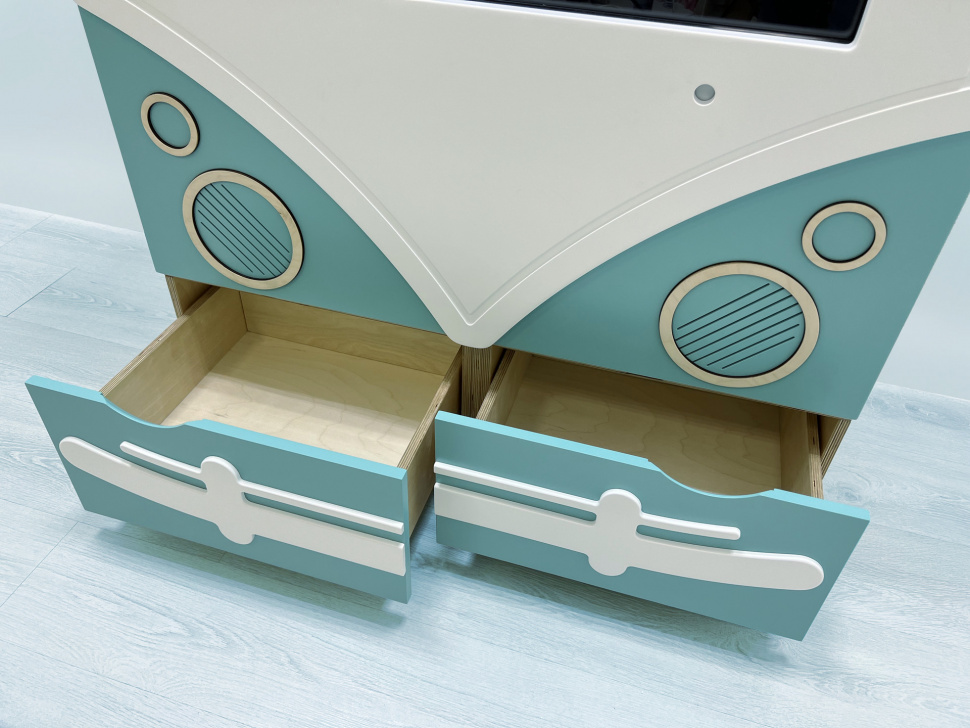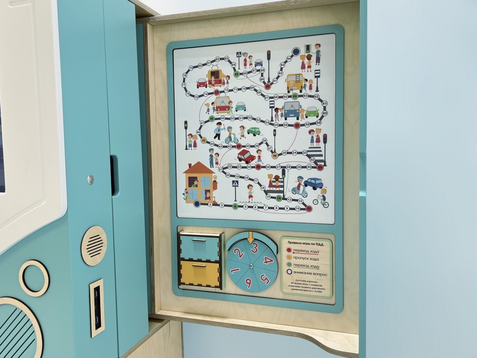 В нижней части панели-автобуса предусмотрены два выдвижных ящика для хранения игрушек и методических материалов. Весь интерактивный комплекс имеет колёсики со стопорами, чтобы его легко можно было передвинуть в любое место.