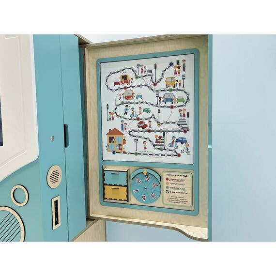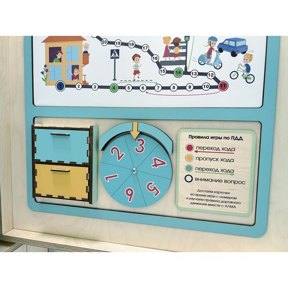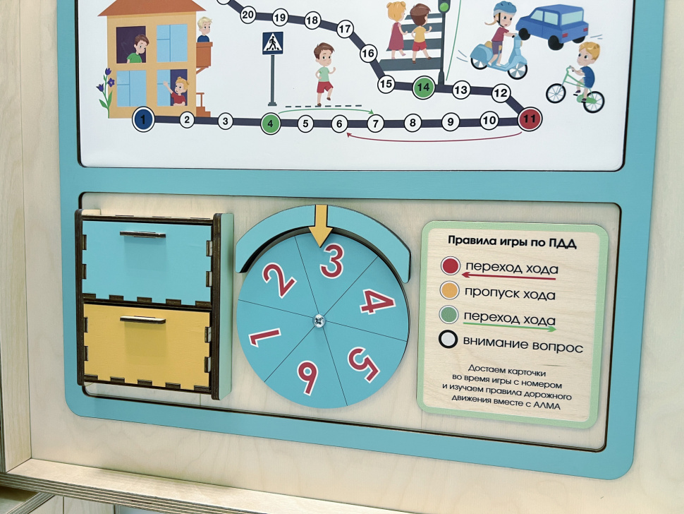 – Развивающая сенсорная панель Монтессори. На ней есть магнитный лабиринт «Дорога», панель «Светофор» и два вращающихся игровых элемента с картинками жизненных ситуаций и связанных с ними дорожных знаков.