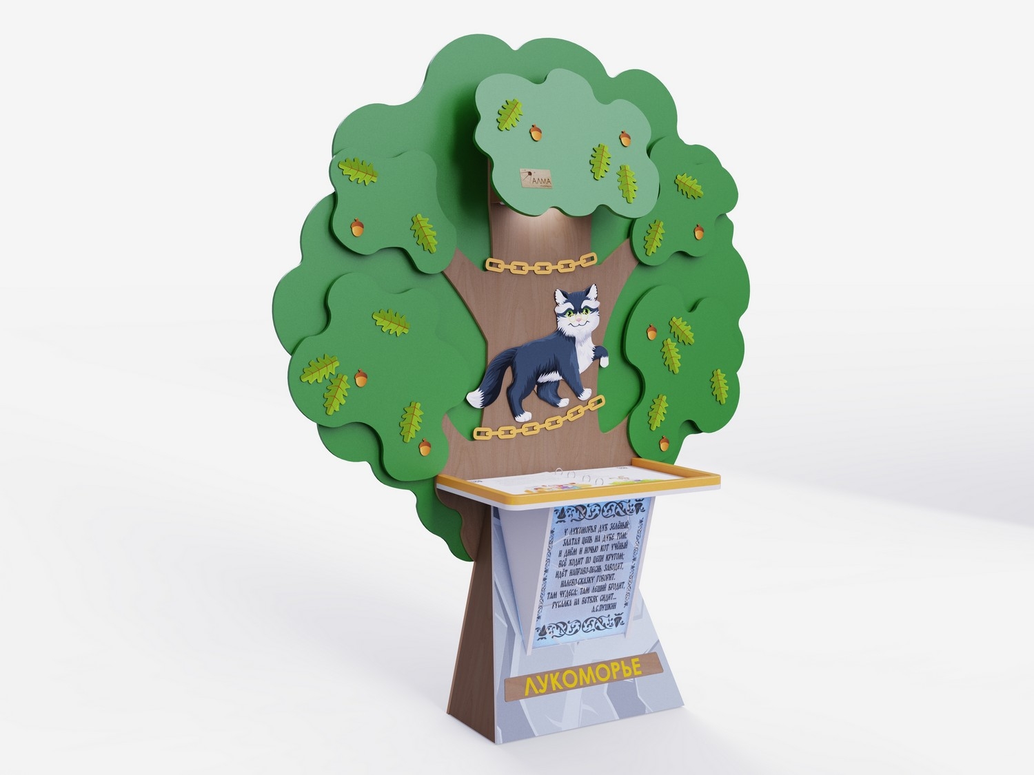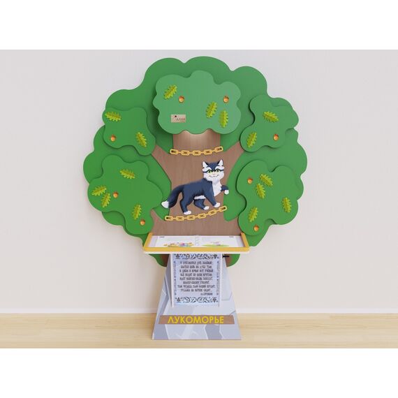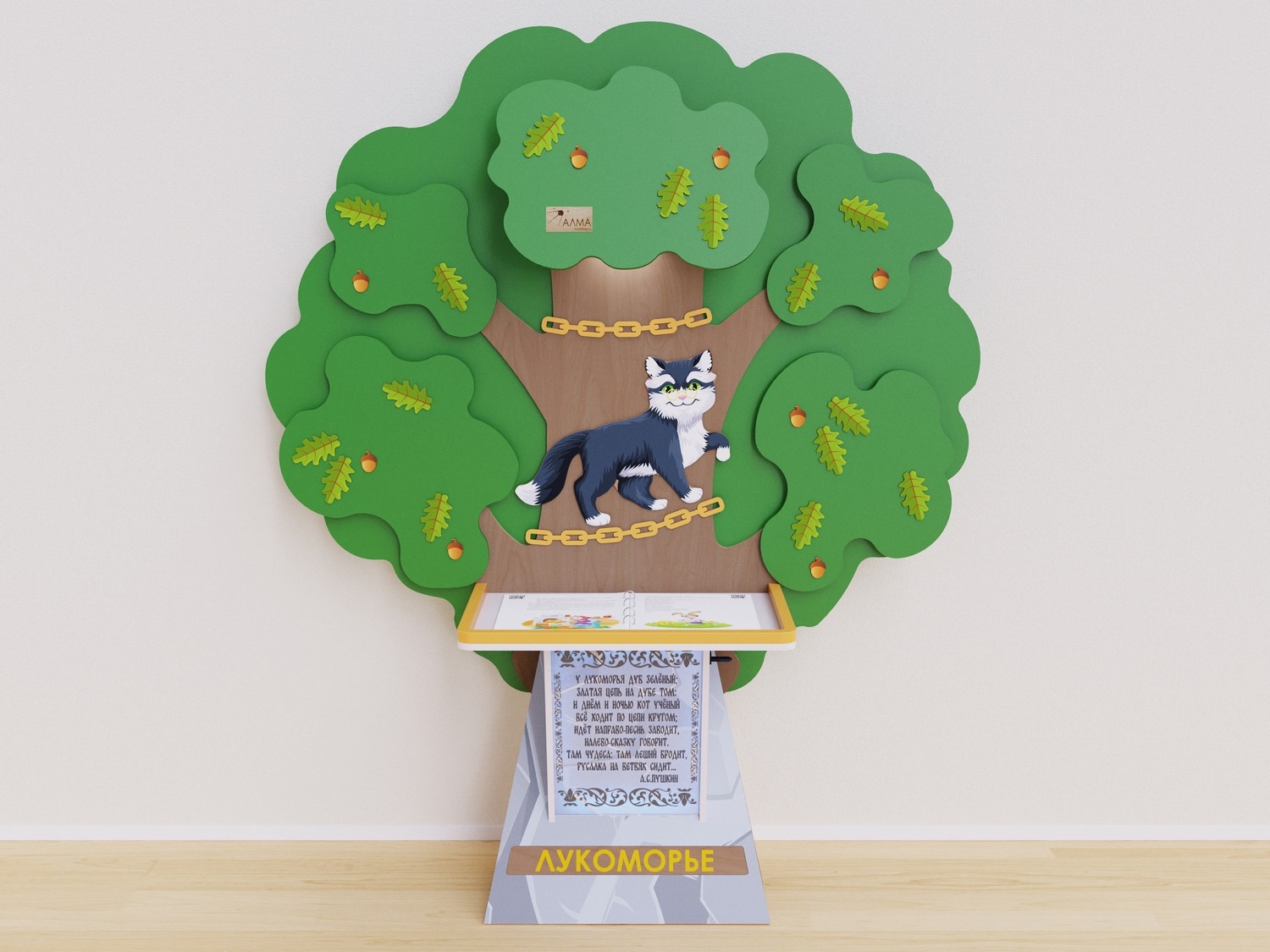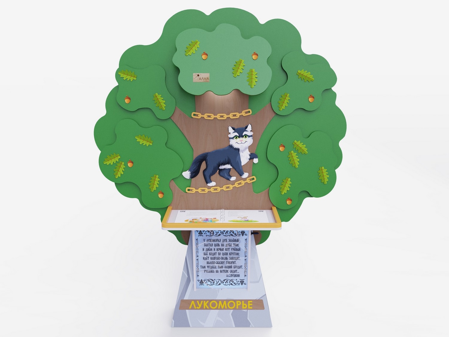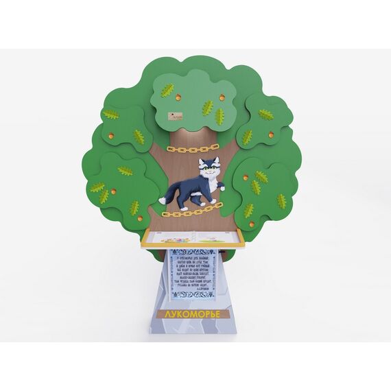 Стойка сконструирована из экологичных и гипоаллергенных материалов, гарантирует безопасность и долговечность даже в условиях интенсивного использования. Дизайн стойки выполнен в узнаваемом виде сказочного дуба, вокруг которого по цепи ходит кот. Дополнен цитатой из поэмы «Руслан и Людмила» А.С. Пушкина «У лукоморья дуб зеленый...».