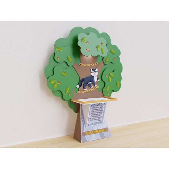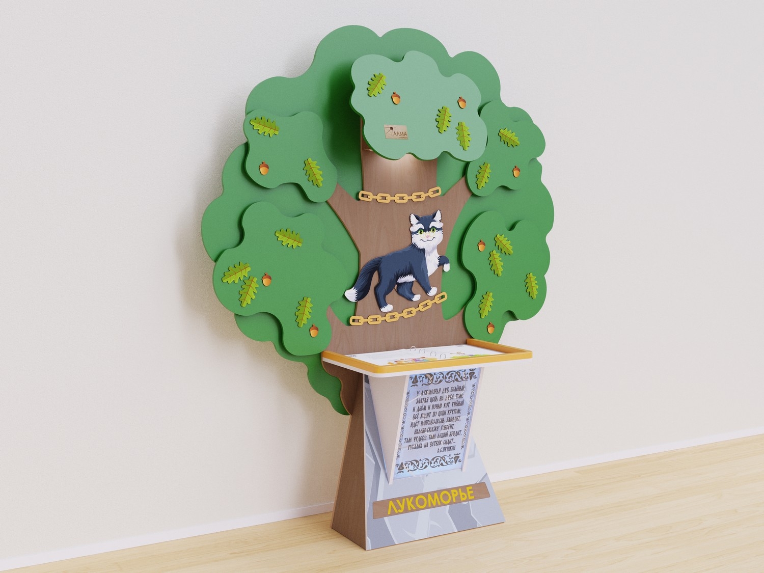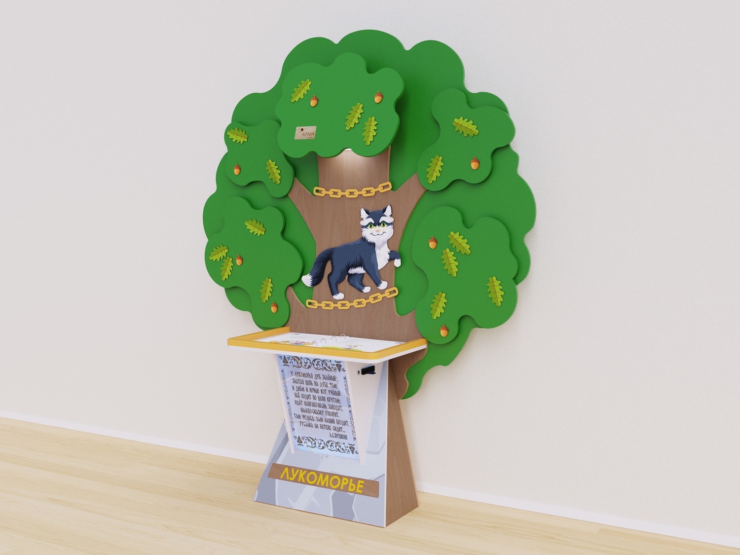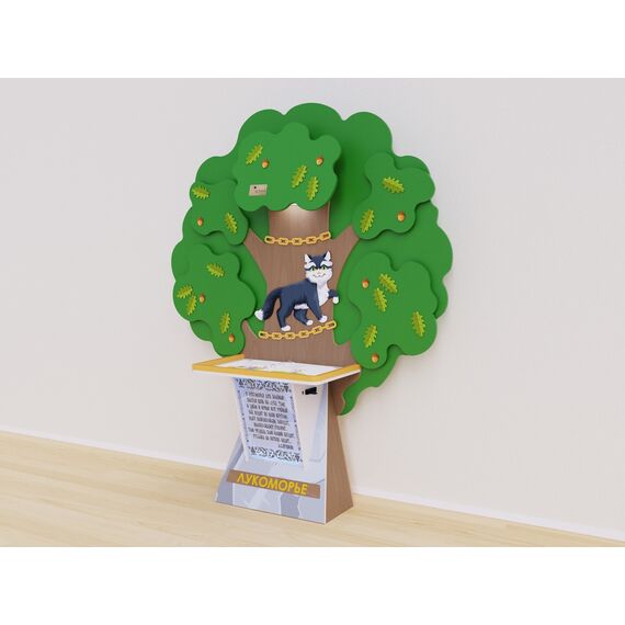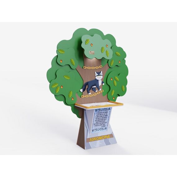 Стойка сконструирована из экологичных и гипоаллергенных материалов, гарантирует безопасность и долговечность даже в условиях интенсивного использования. Дизайн стойки выполнен в узнаваемом виде сказочного дуба, вокруг которого по цепи ходит кот. Дополнен цитатой из поэмы «Руслан и Людмила» А.С. Пушкина «У лукоморья дуб зеленый...».