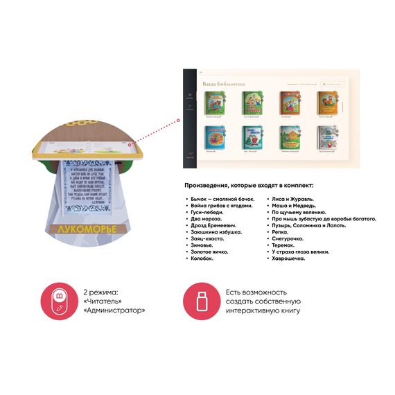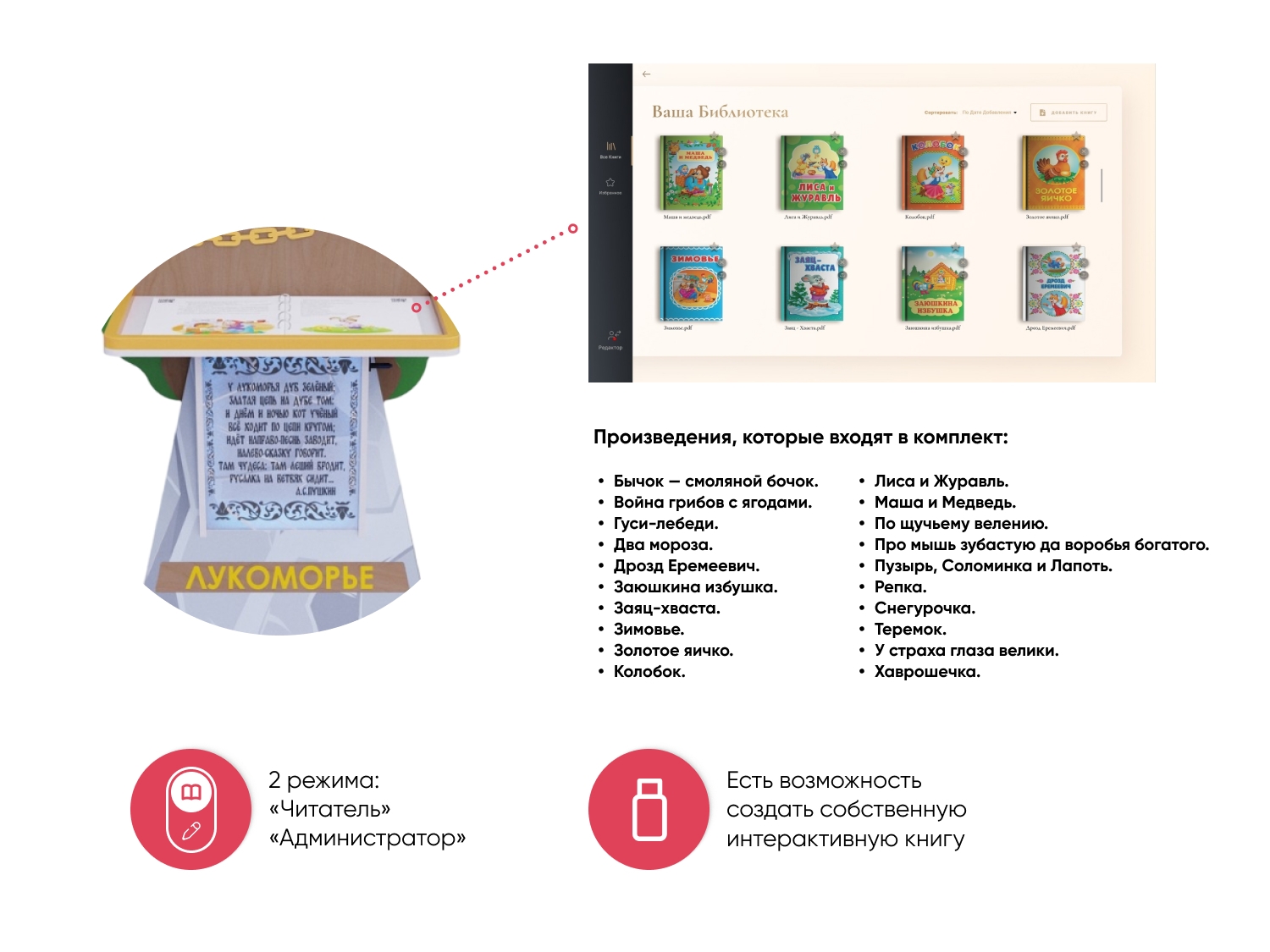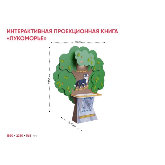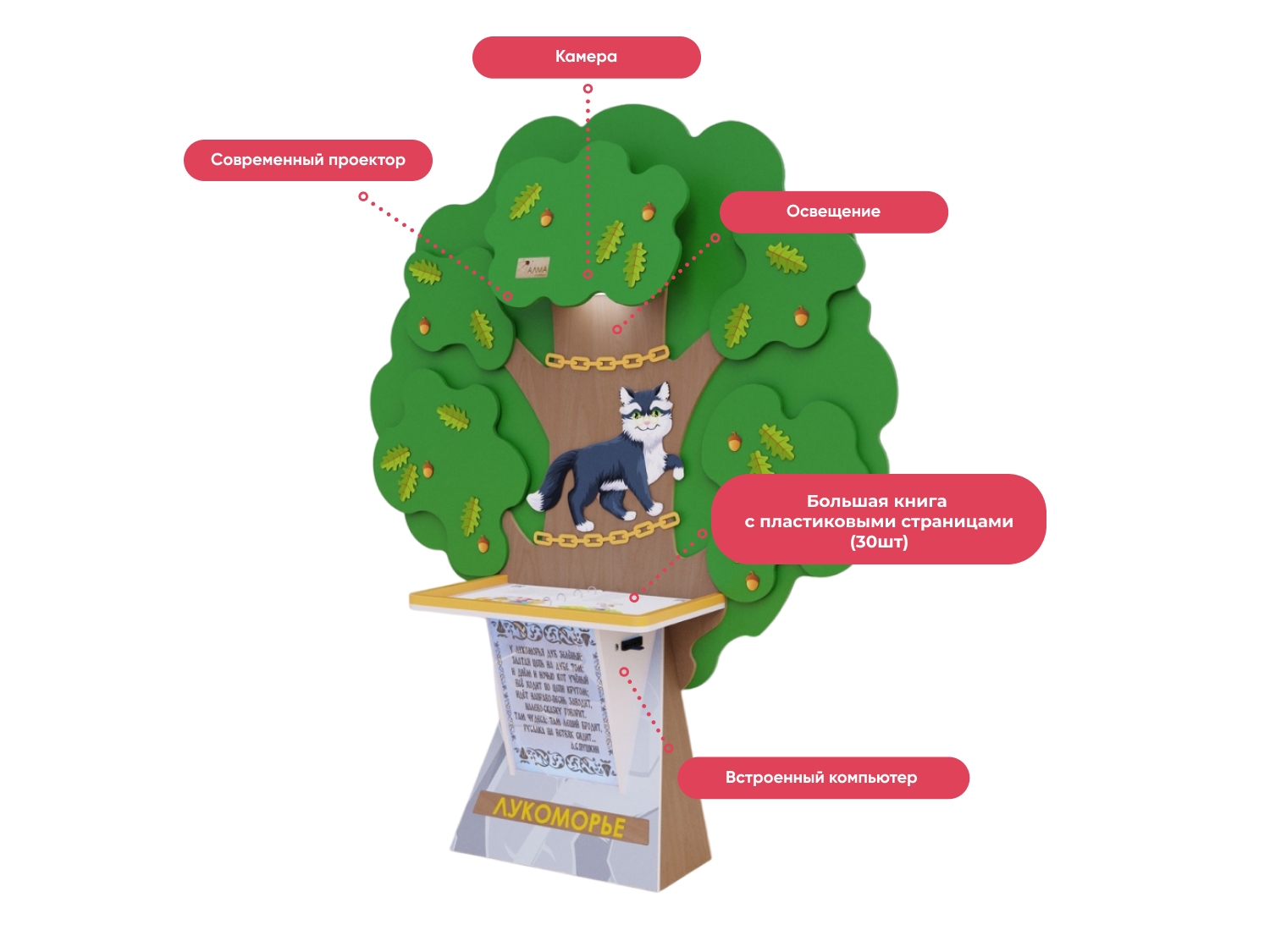 Стилизованная стойка с интерактивной презентацией сказок: большая книга с пластиковыми страницами, на которые проецируются иллюстрации и текст. Содержание страниц меняется при их перелистывании. Инсталляция создана для размещения в музеях, библиотеках, школьных уголках, центрах развития и других пространствах, где дети могут познакомиться с книгой.