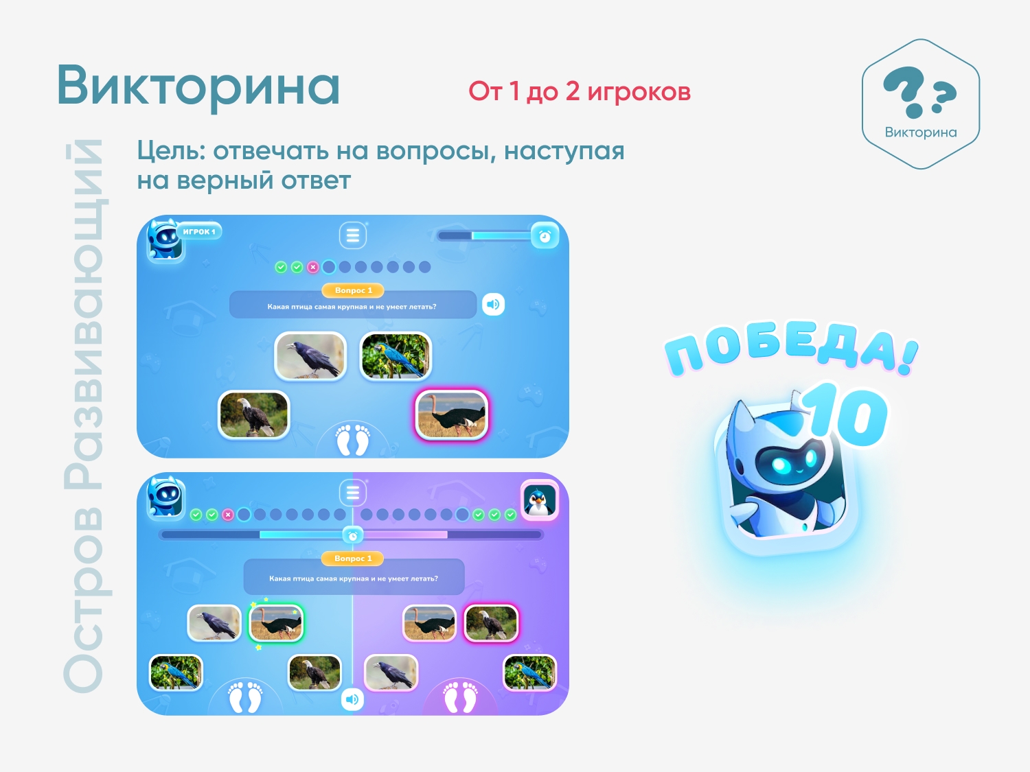 Игровой формат обучения нравится детям и позволяет им развиваться в увлекательной интерактивной среде: улучшение координации, логики, скорости реакции и внимания, сброс накопившейся энергии и формирование здорового духа соперничества при соревновательных играх.