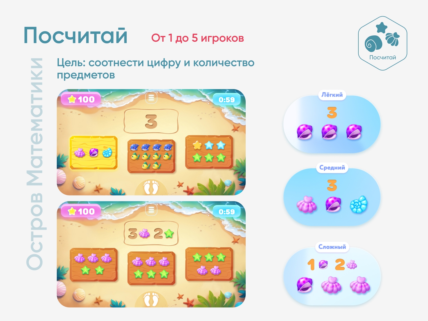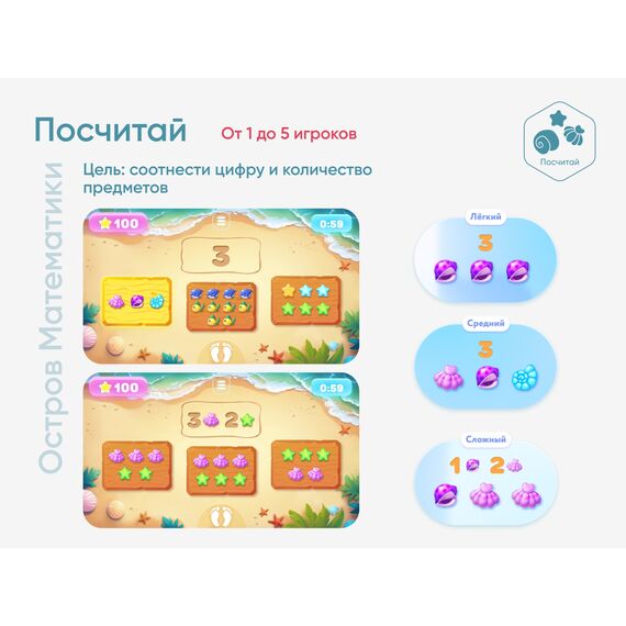 Предусмотрено 3 уровня сложности: Легкий: в ответах используются предметы одного типа. Средний: в ответах смешаны предметы разных типов. Сложный: надо найти и посчитать предметы двух конкретных типов.