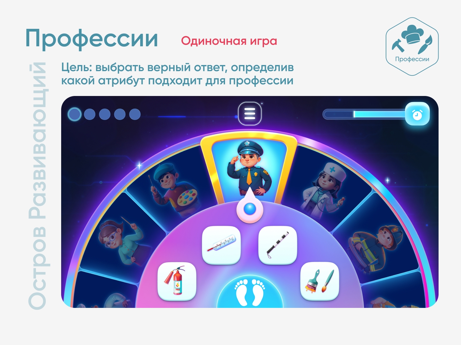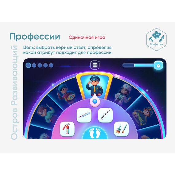 Цель игры — выбрать верный ответ, определив какой атрибут подходит для профессии. Одна игра состоит из 5 вопросов. Уровней сложности нет.