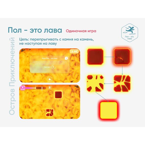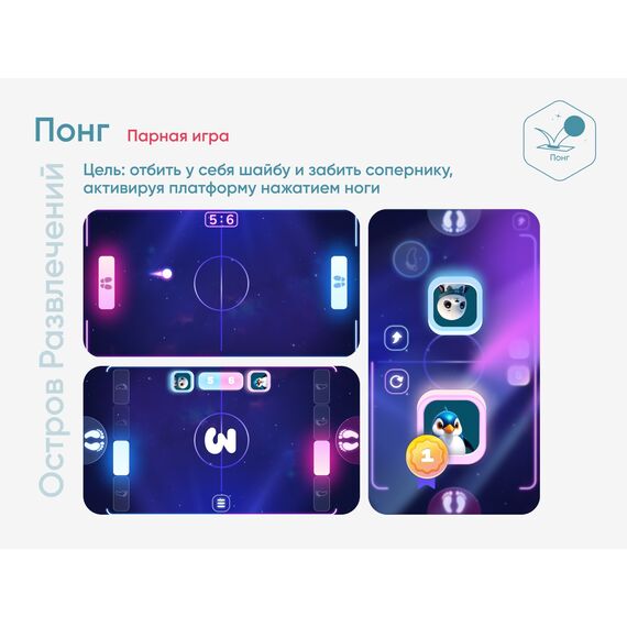 Разработка российских специалистов для игр и обучения через физическую активность: приложение проецирует игры через камеру с сенсорной чувствительностью на игровую поверхность. Для прохождения заданий детям надо быстро прыгать или аккуратно переступать с точки на точку — в зависимости от специфики конкретной игры.