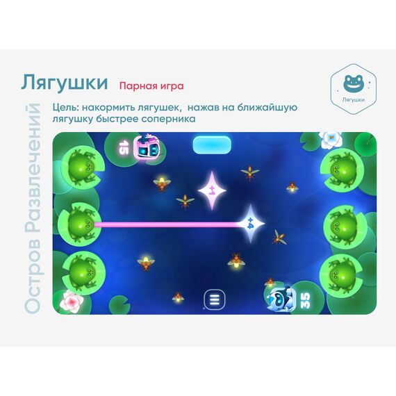Цель игры — накормить своих лягушек. Для этого надо, ориентируясь на движущихся насекомых в центре площадки, нажать на ближайшую лягушку на своем игровом поле быстрее соперника и заработать больше баллов. Уровней сложности нет.