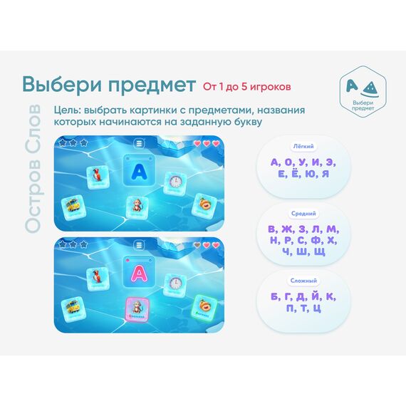Цель игры — выбрать картинки с предметами, названия которых начинаются на заданную букву. Задание содержит 2 верных ответа.