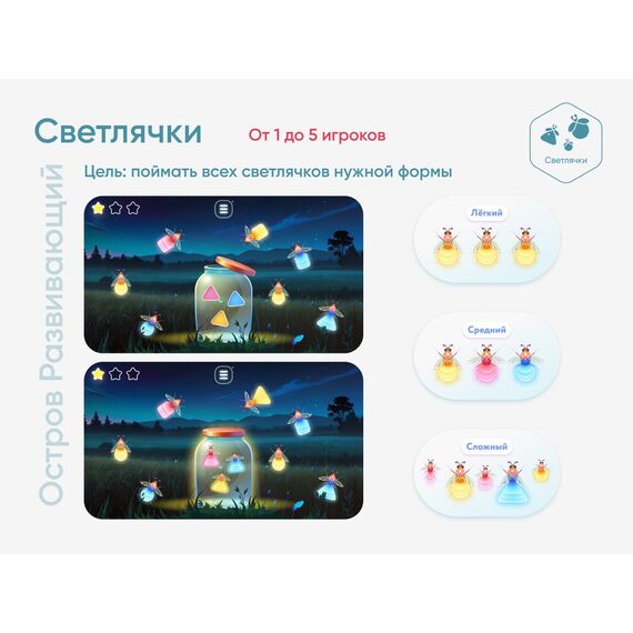 Цель игры — поймать всех светлячков нужной формы. Задание с указанием формы и цвета светлячков для ловли изображено на банке.