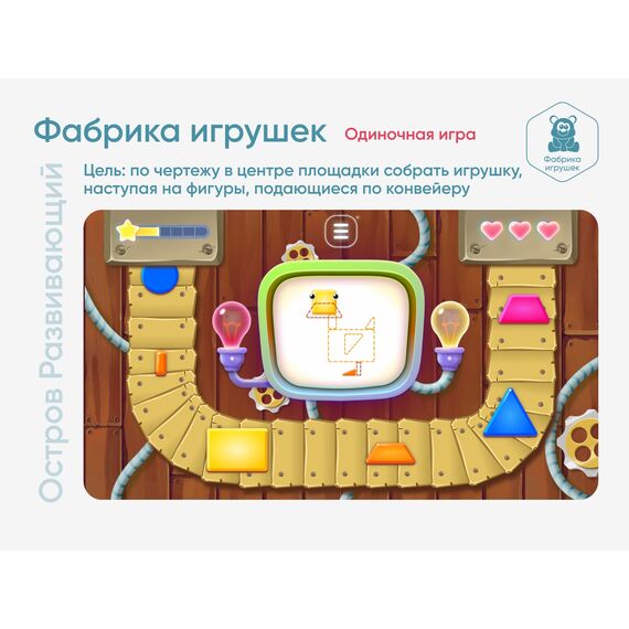 Цель игры — ориентируясь на чертеж в центре площадки, собрать игрушку из геометрических фигур, наступая на верные фигуры, подающиеся по конвейеру.