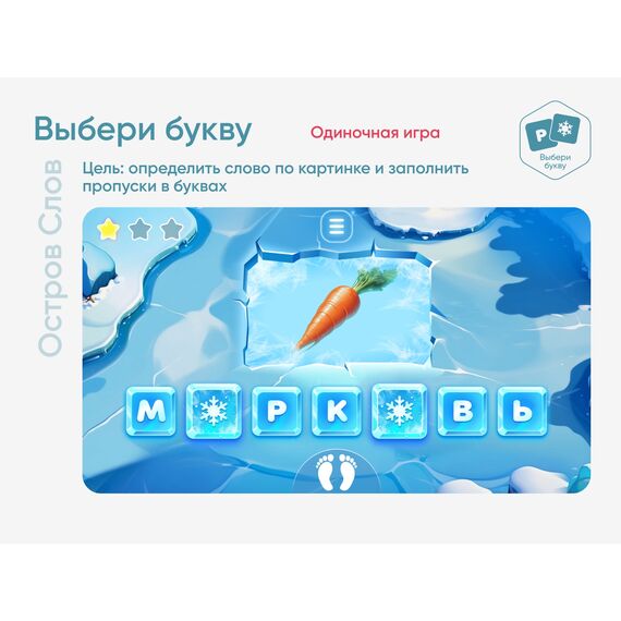 Цель игры — определить слово по картинке и заполнить пропуски в буквах. Для выбора пропущенной буквы игроку нужно наступить на снежинку, после чего появится список возможных ответов.