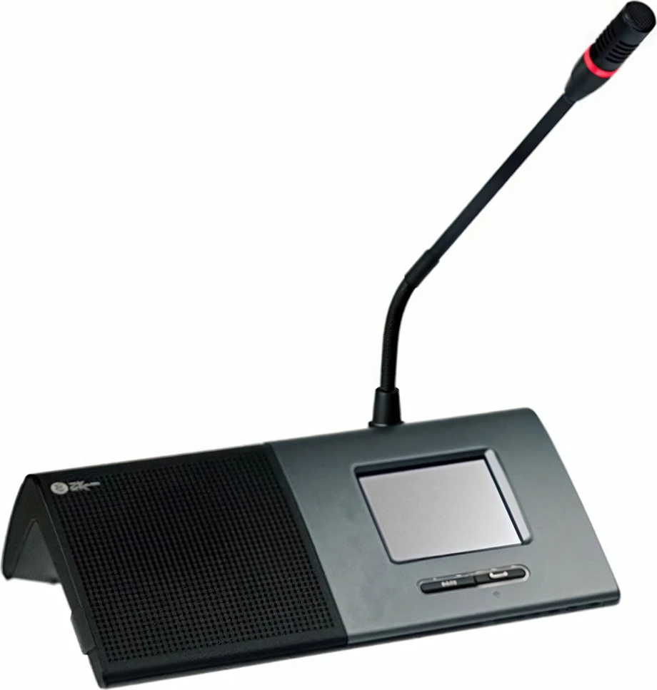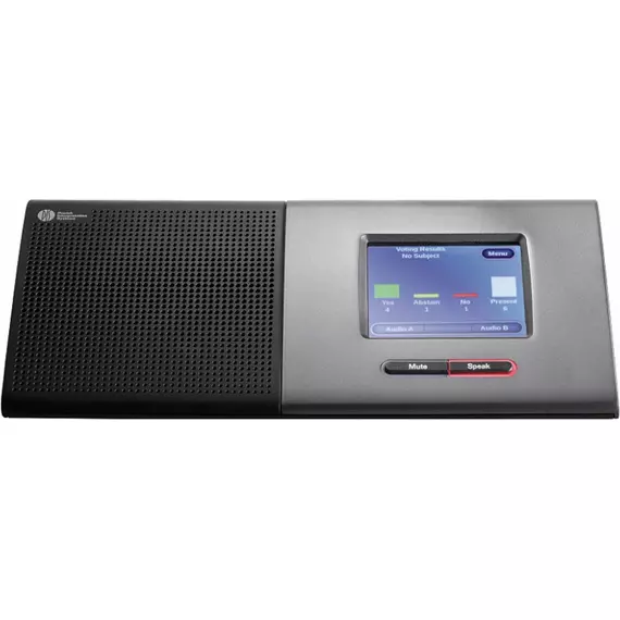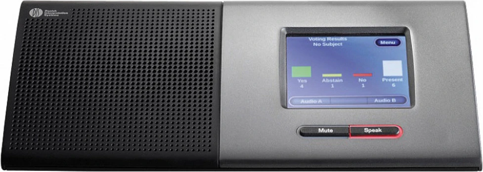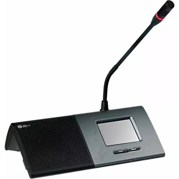 Микрофонный настольный пульт предназначен для использования как одним, так и двумя делегатами. При использовании микрофонного пульта двумя делегатами подсчет голосов, регистрация, наведение камер и т.д. производятся для каждого делегата независимо. На задней стенке пульта специально выделено место для различной информации — имен участников, логотипов и т.д. Благодаря гибко настраиваемой функциональности микрофонный пульт может использоваться как микрофонный пульт председателя, делегата (делегатов), секретаря, оператора и т.д. Режимы работы: автоматический, FIFO, ручной, голосовой активации, а также смешанные варианты работы.