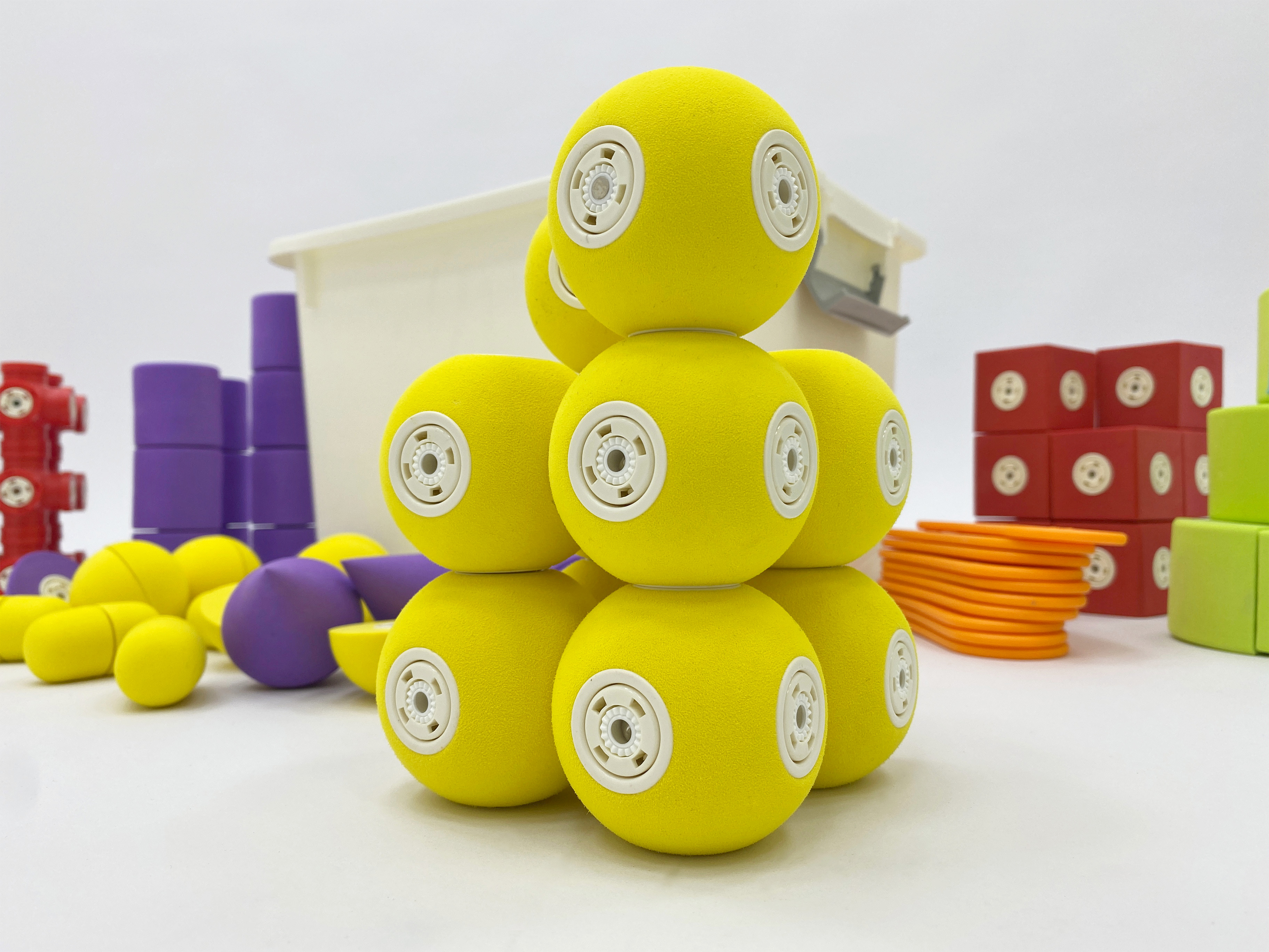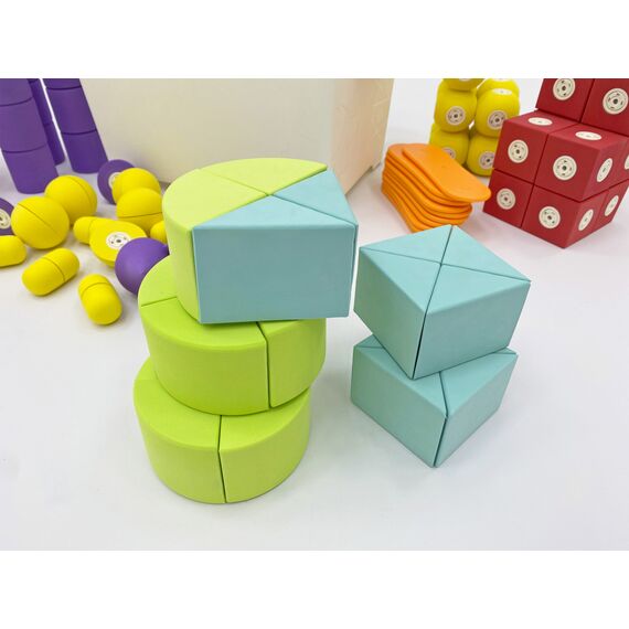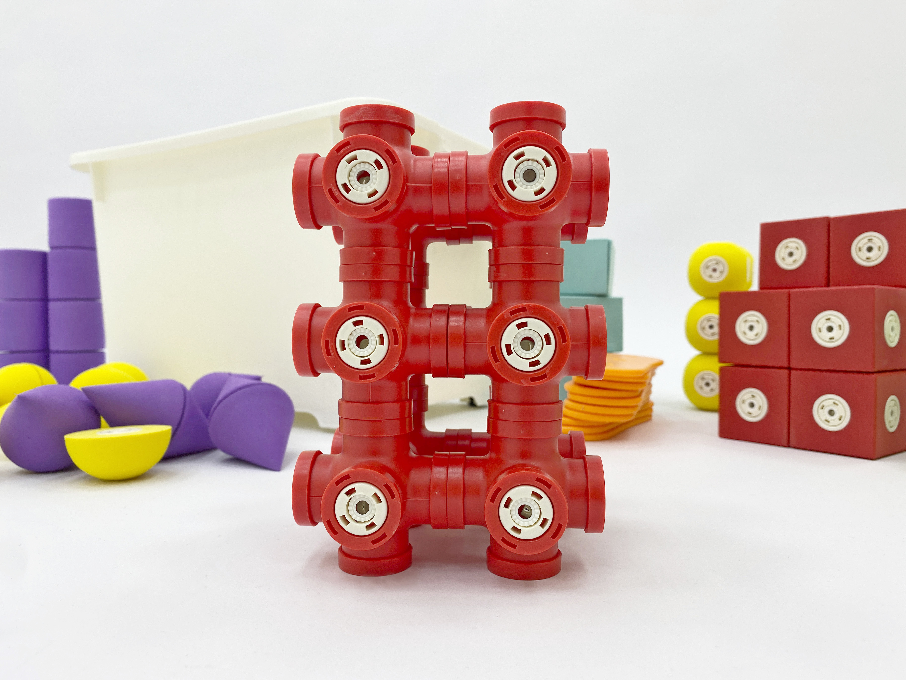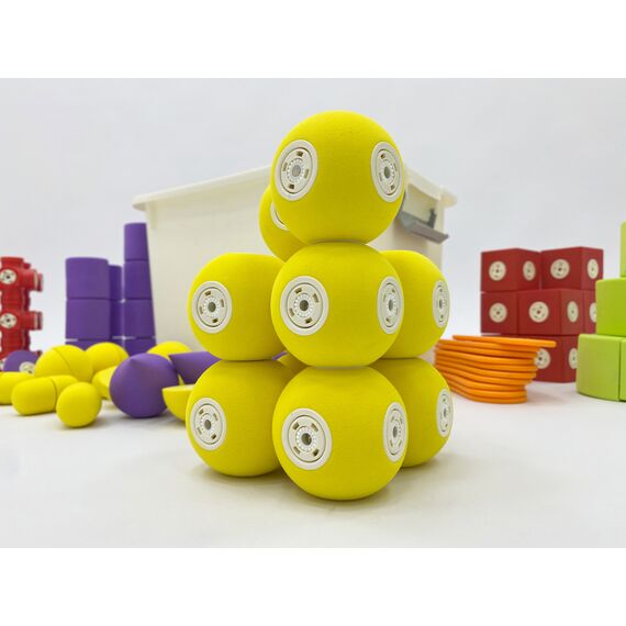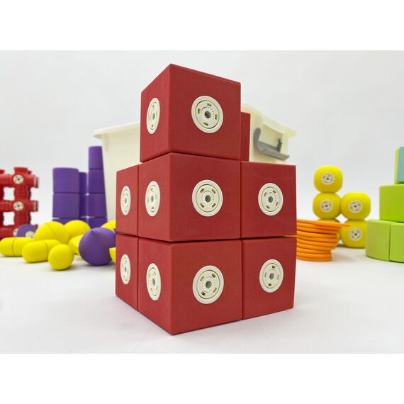 Детали конструктора окрашены в приятные однотонные цвета, со звуковым эффектом погремушки. Каждая из деталей имеет от 1 до 9 вариантов магнитной стыковки, что практически не ограничивает ребенка в конструировании. Простые детали отлично подходят для детей младшей группы ДОУ, детей с ОВЗ и РАС. Более сложные по форме и креплениям детали предназначены для детей средней и старшей группы.