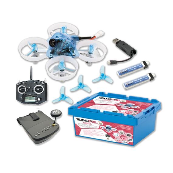 Набор состоит из большого количества безопасных FPV квадрокоптеров, полноценного набора гоночной трассы, автоматической системы подсчета времени, методического пособия по практике управления дронами и массы важных для обучению полётам вещей.