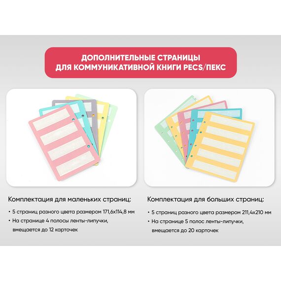 Набор из 5 дополнительных страниц, вкладывающихся в коммуникативную книгу для карточек PECS/ПЕКС. Пластиковые листы пяти различных цветов имеют полосы из ленты-липучки велкро, куда помещаются коммуникативные карточки PECS/ПЕКС.