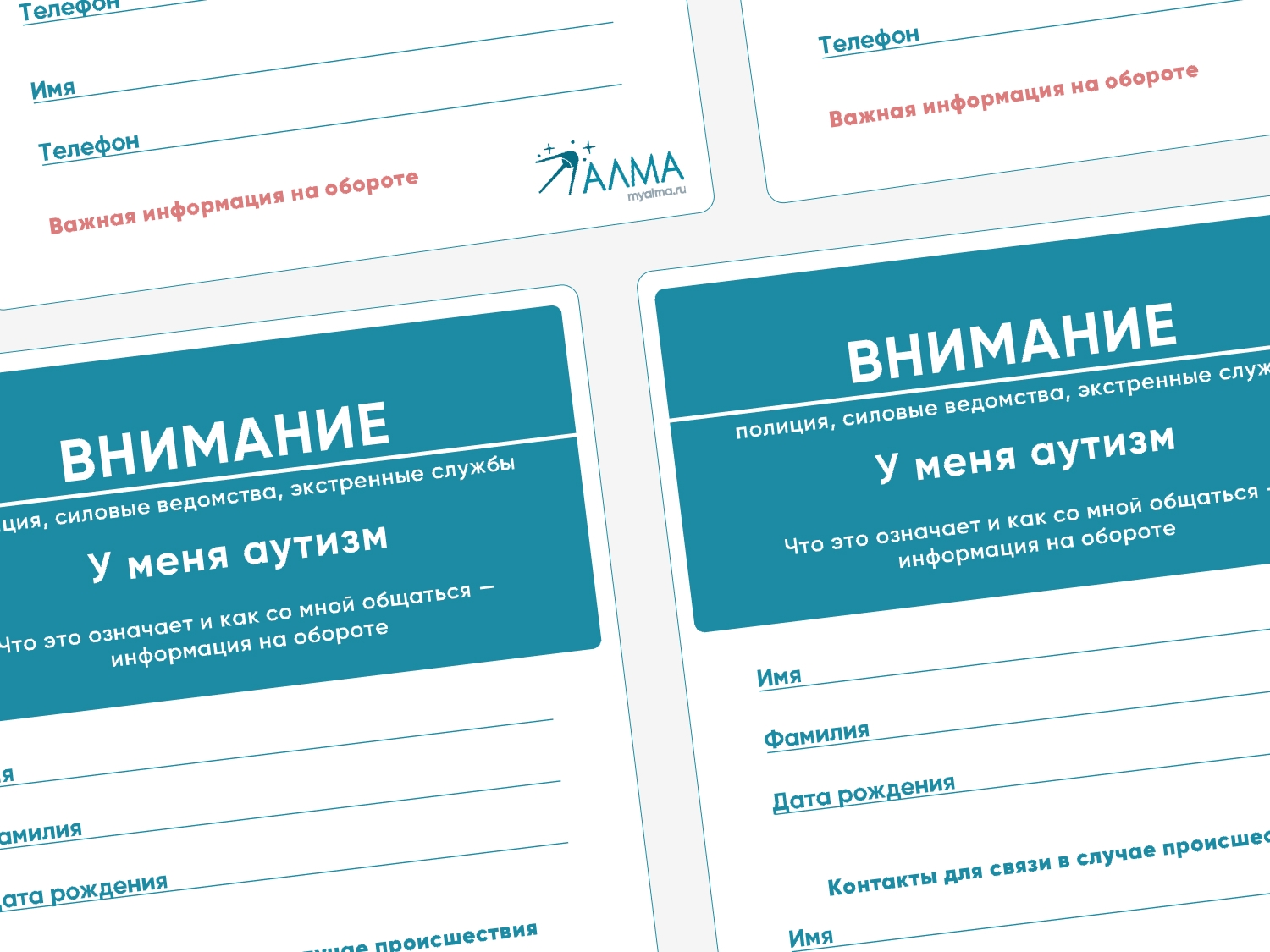 Информационные материалы для окружающих людей, которые могут помочь ребенку с РАС: листовка с контактными данными и алгоритмом помощи, бейдж, карточка с QR-кодом для скачивания листовок.