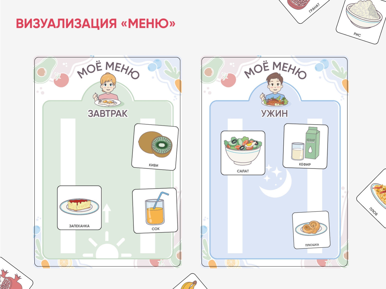 Пособие для ориентировки ребенка в питании в течении дня. Помогает снять напряжение, поддерживает мотивацию ребенка. Вариант для мальчика и для девочки.