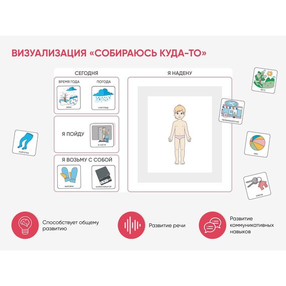 Визуальные опоры для организации помощи ребенку в процессе сборов куда-либо, снимает психоэмоциональное напряжение, помогает упорядочить действия. Вариант для мальчика и для девочки.