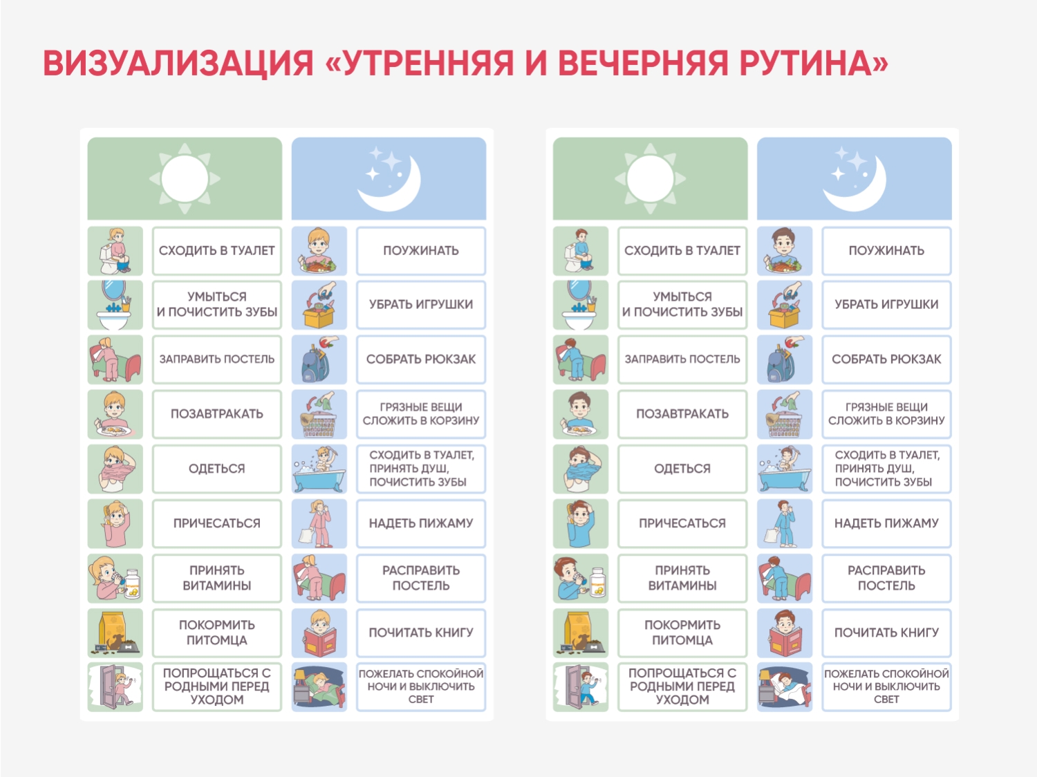 Визуальные опоры по типу поведенческой цепочки для организации поведения ребенка в структурированные отрезки времени: утром и вечером. Вариант для мальчика и для девочки.