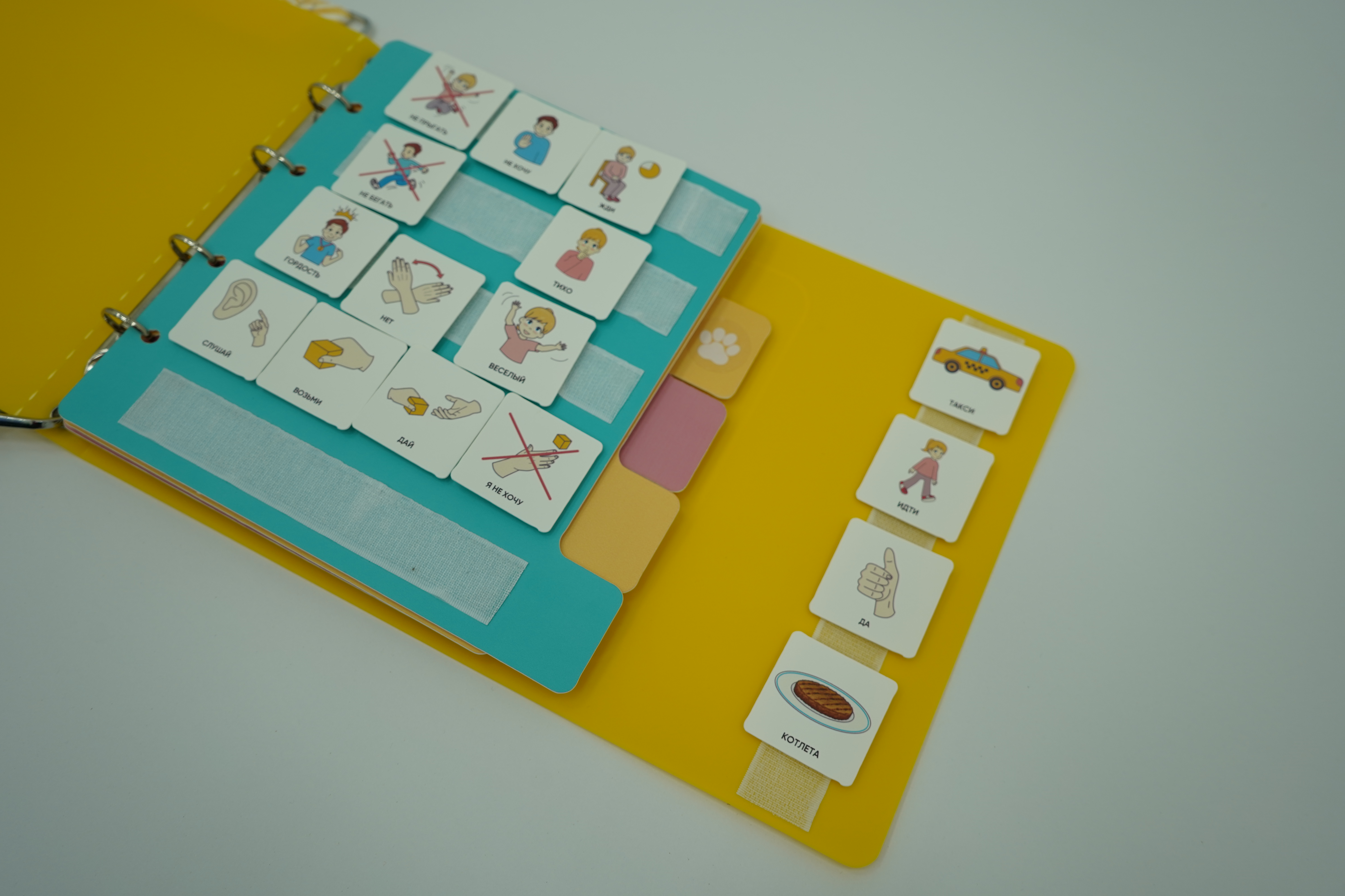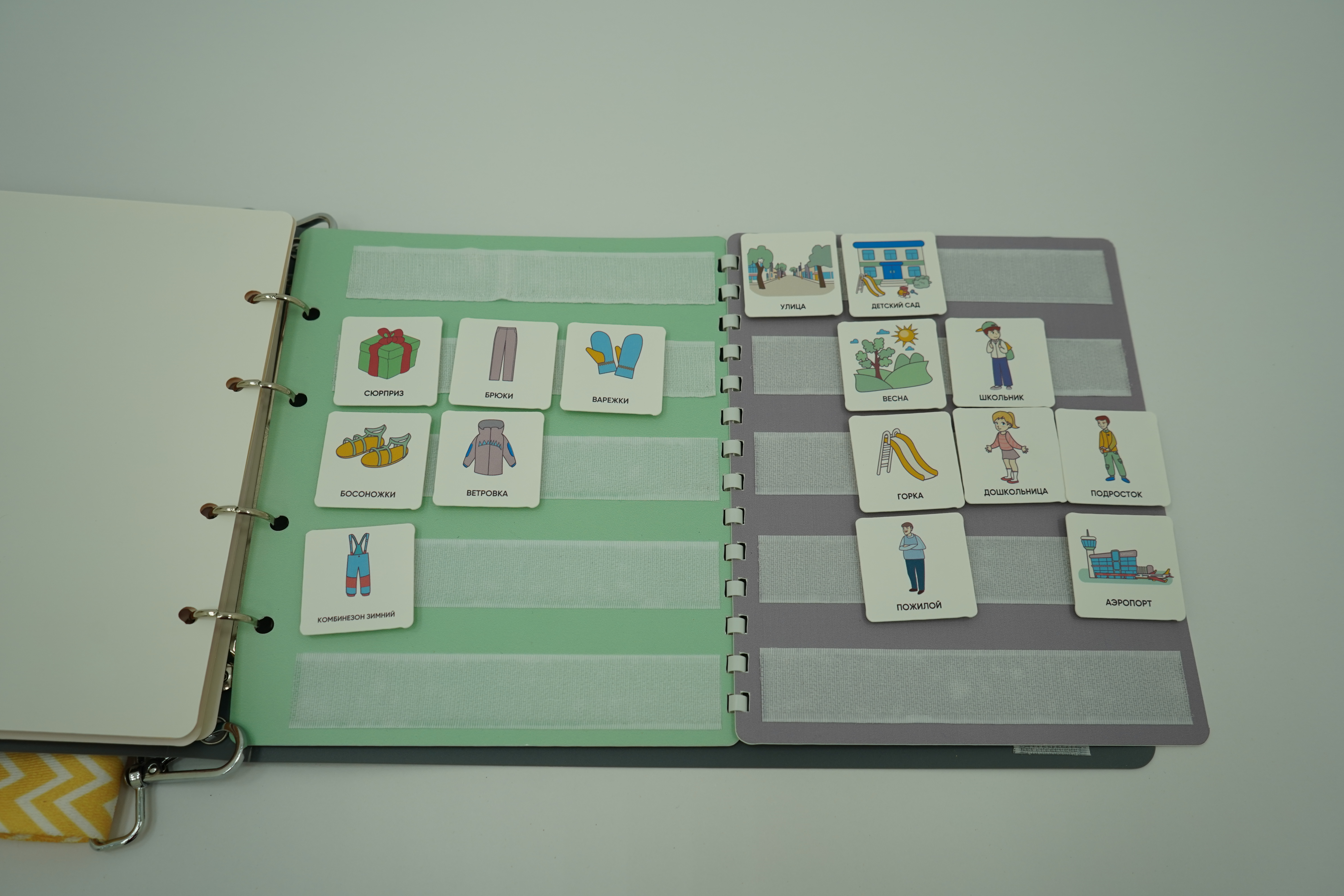 Инструмент для альтернативной/дополнительной коммуникации у детей, имеющих проблемы с речью (в том числе, РАС). Это пластиковая папка на кольцах, куда вкладываются жёсткие листы с рядами ленты-липучки велкро. На ленту приклеиваются карточки PECS/ПЕКС, служащие средством обмена информации между неговорящим ребёнком и взрослым.