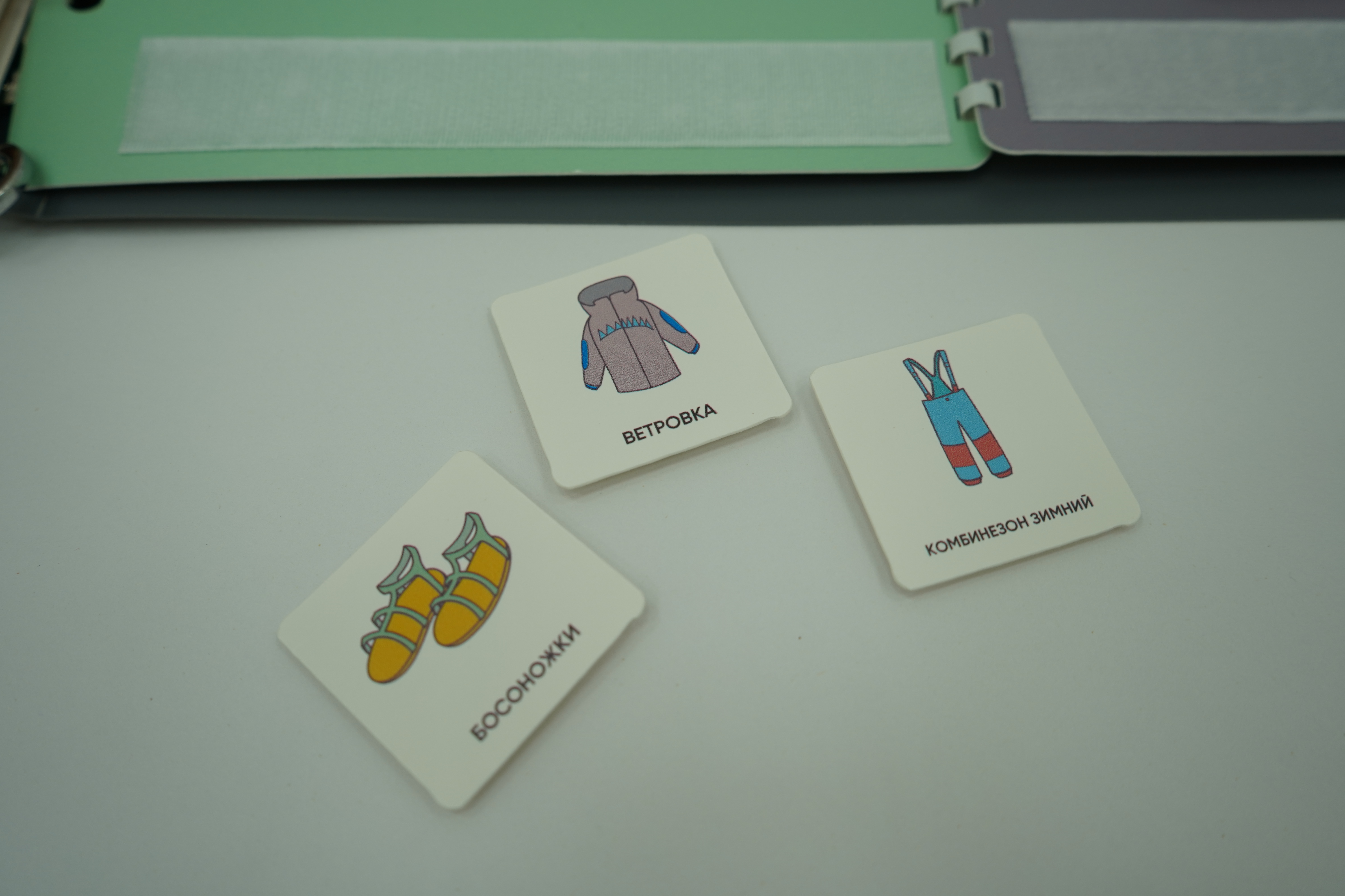 Снизу папки выступает коммуникативная полоса, она сделана так, чтобы карточки на ней всегда были перед глазами ребёнка. Это своеобразная мессенджер-строка, куда ребёнок перемещает нужные ему карточки из общей папки и выстраивает предложение.