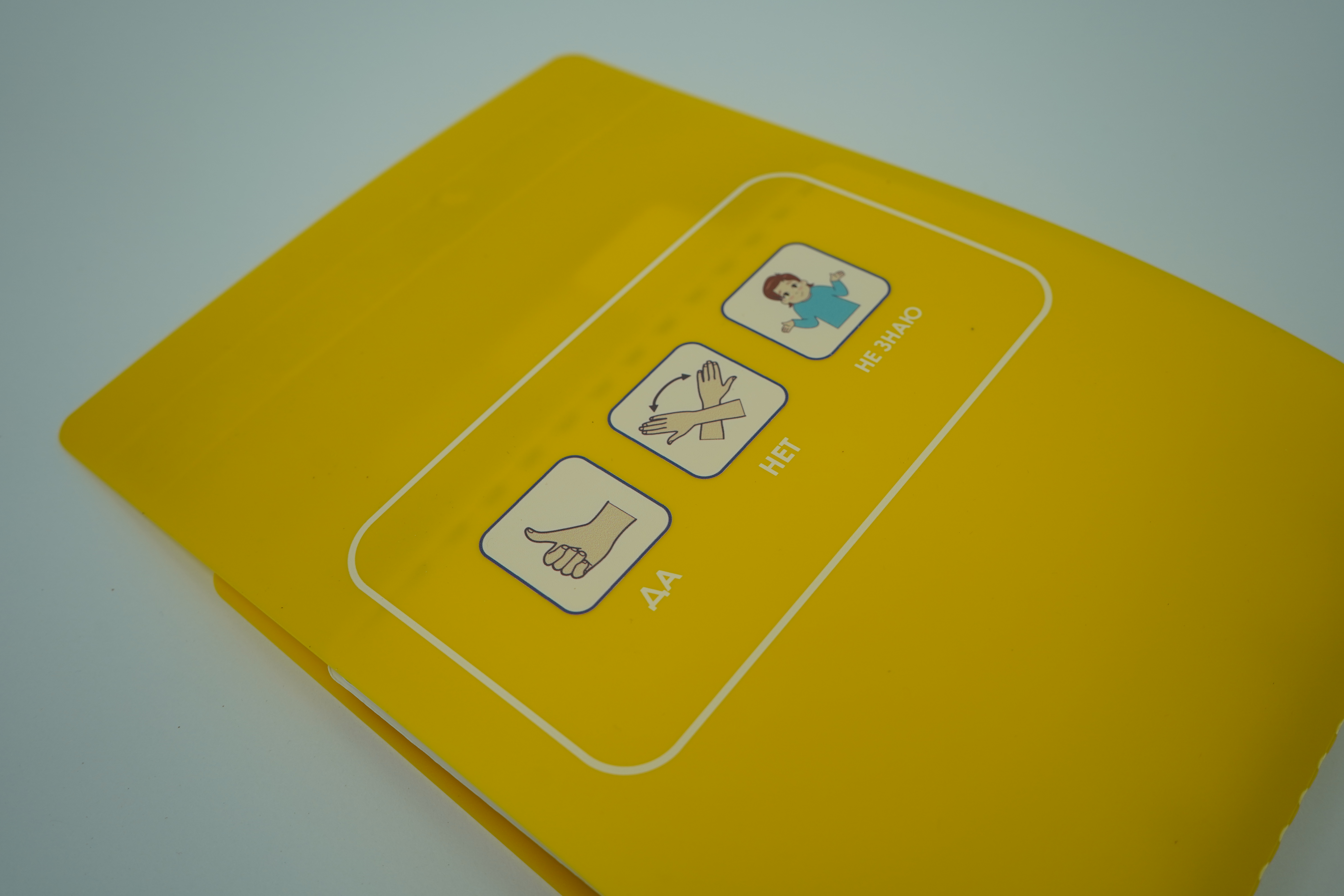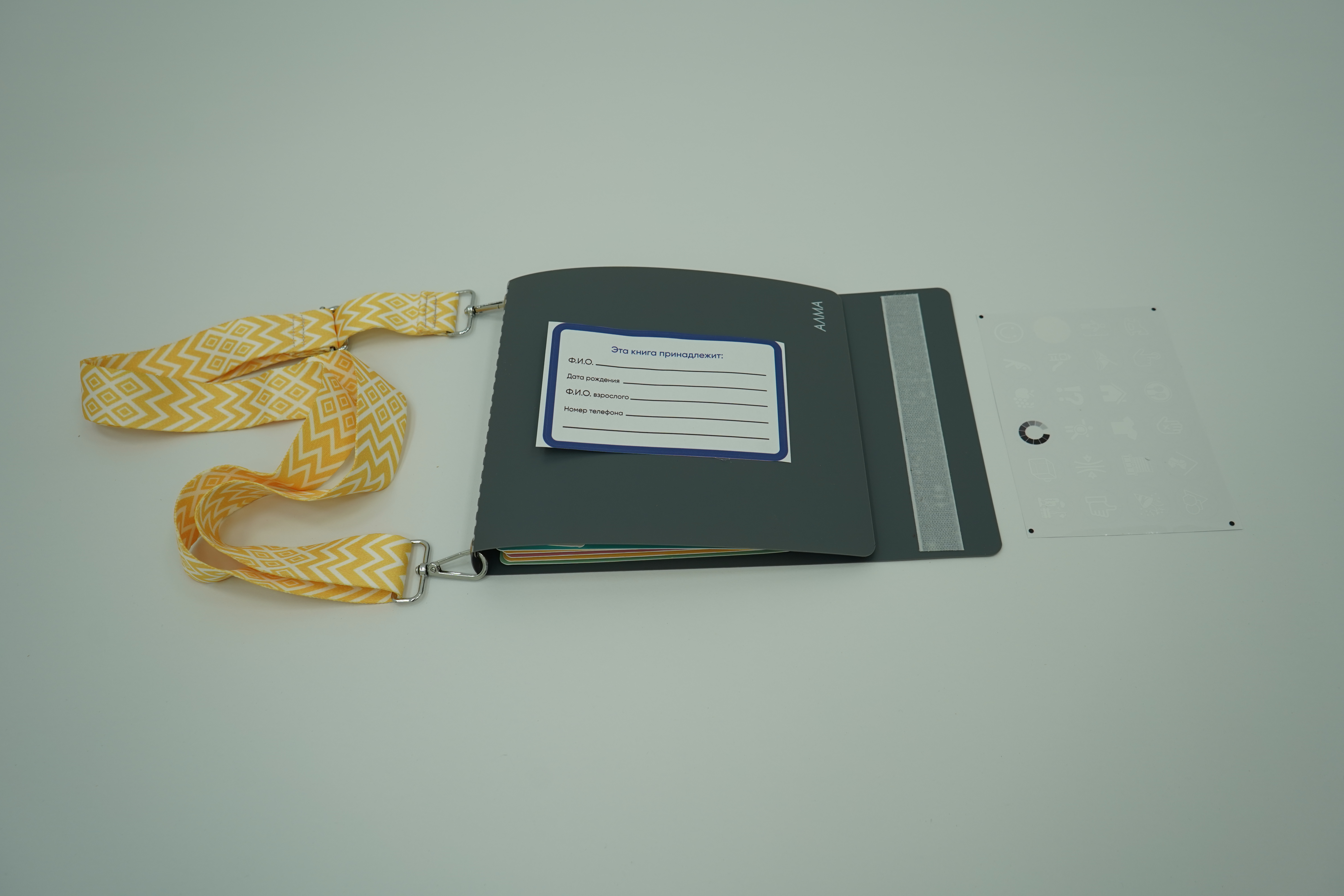 В комплекте есть тематические наклейки на страницы (для быстрого ориентирования) и наклейка-адресник. На задней стороне книги печать 3х символов: «да», «нет», «не знаю» - они позволяют ребёнку быстро сообщить собеседнику краткий ответ.