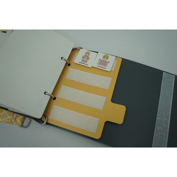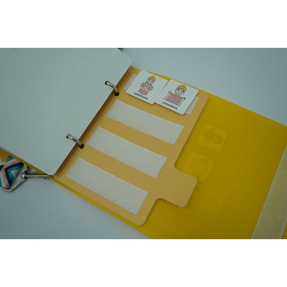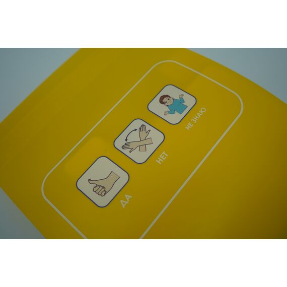 В комплекте есть тематические наклейки на страницы (для быстрого ориентирования) и наклейка-адресник. На задней стороне книги печать 3х символов: «да», «нет», «не знаю» - они позволяют ребёнку быстро сообщить собеседнику краткий ответ.