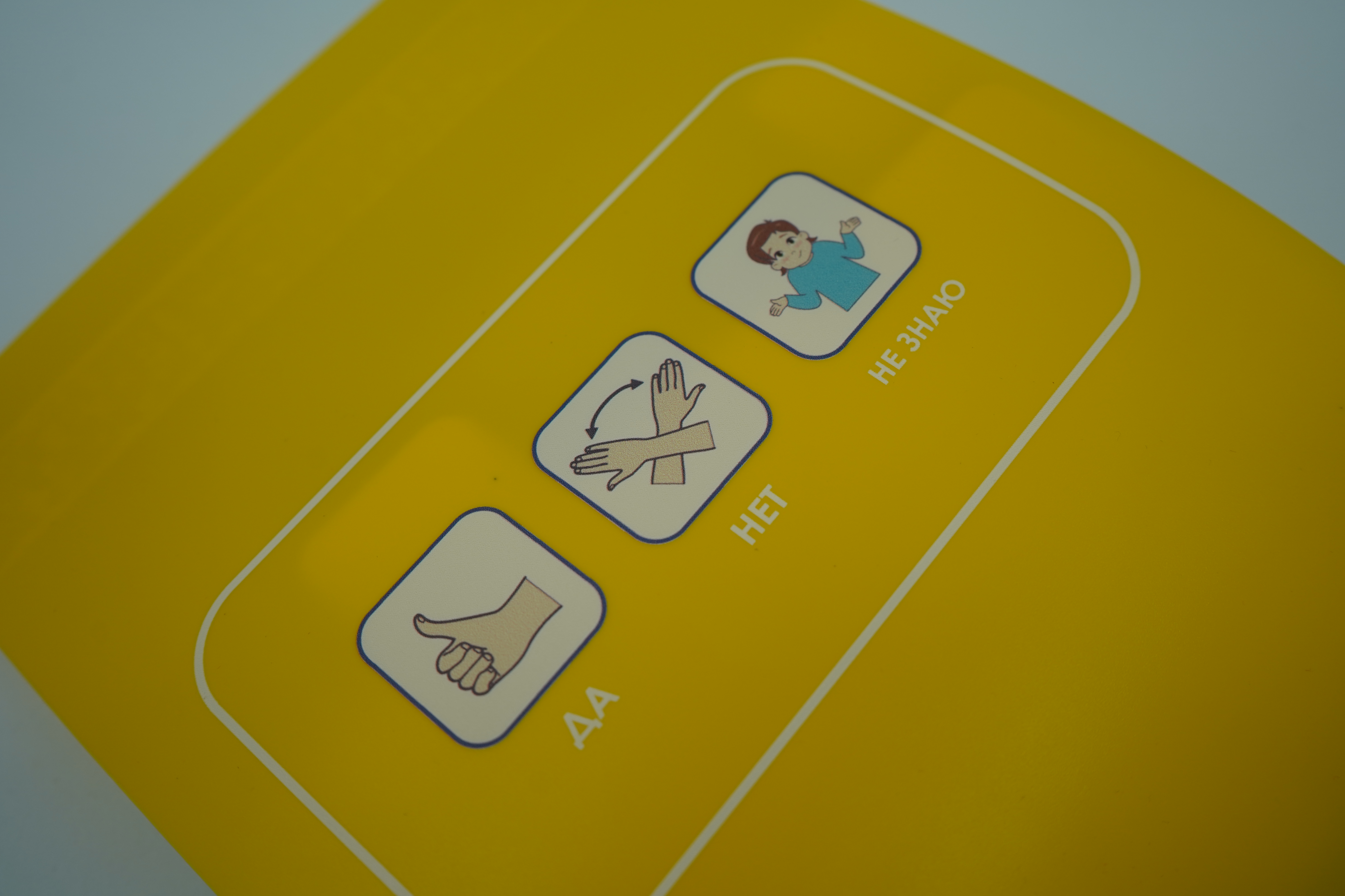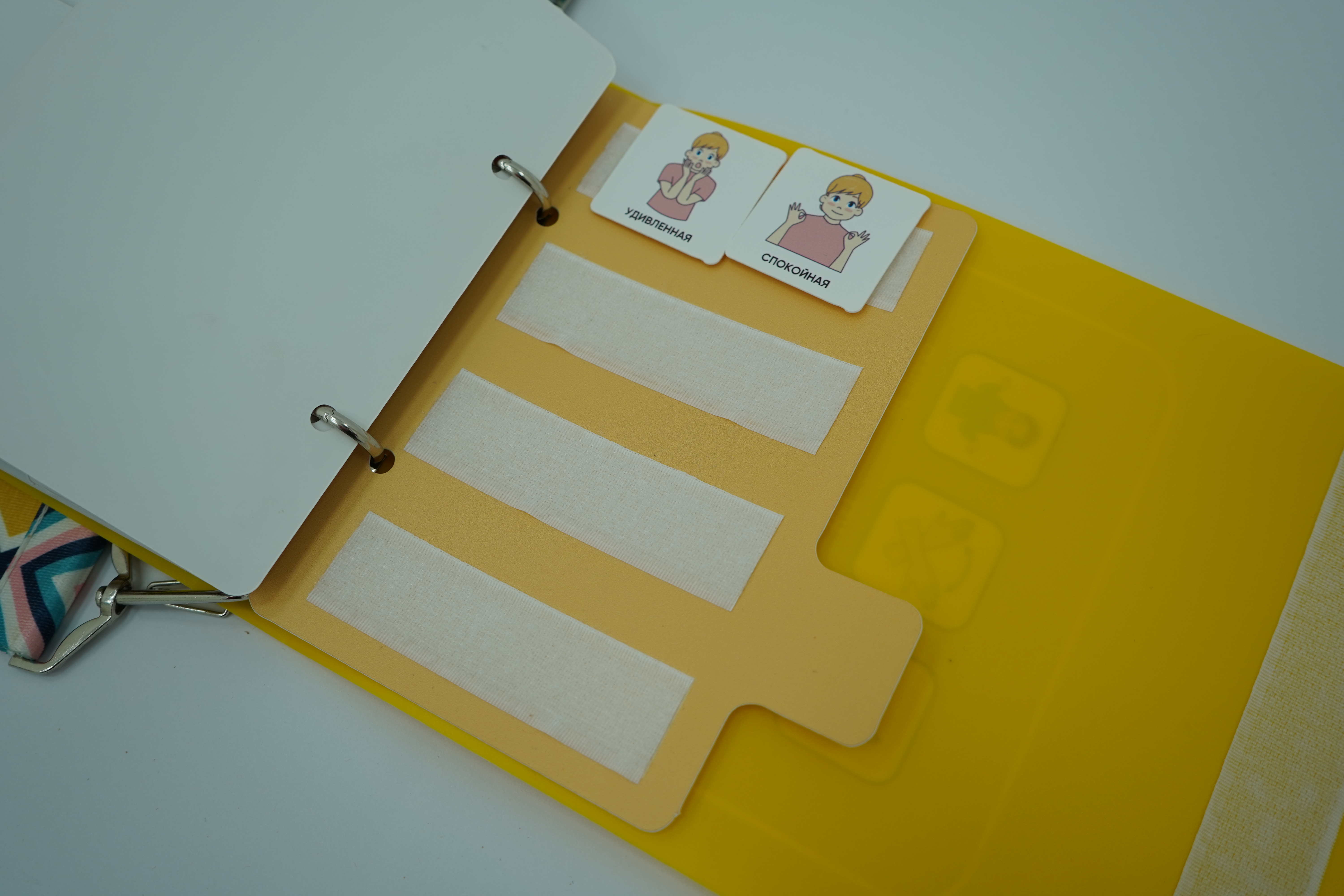 В комплекте есть тематические наклейки на страницы (для быстрого ориентирования) и наклейка-адресник. На задней стороне книги печать 3х символов: «да», «нет», «не знаю» - они позволяют ребёнку быстро сообщить собеседнику краткий ответ.