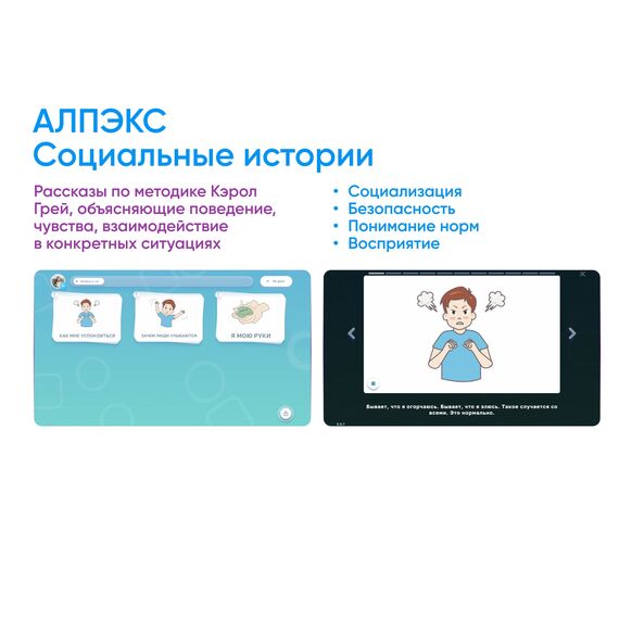 Простые и понятные рассказы объясняют поведение, чувства и взаимодействия в конкретных социальных ситуациях. Например, как мыть руки или зачем люди улыбаются. Истории помогают детям понимать социальные нормы, снижать тревогу перед новыми ситуациями, а также развивать навыки общения и взаимодействия с окружающими.