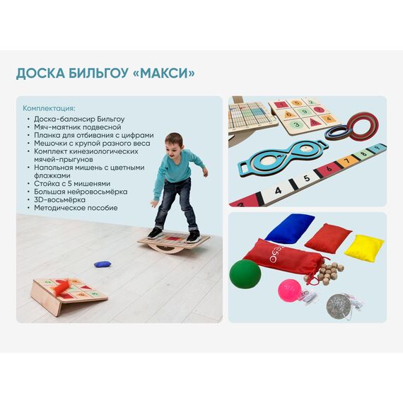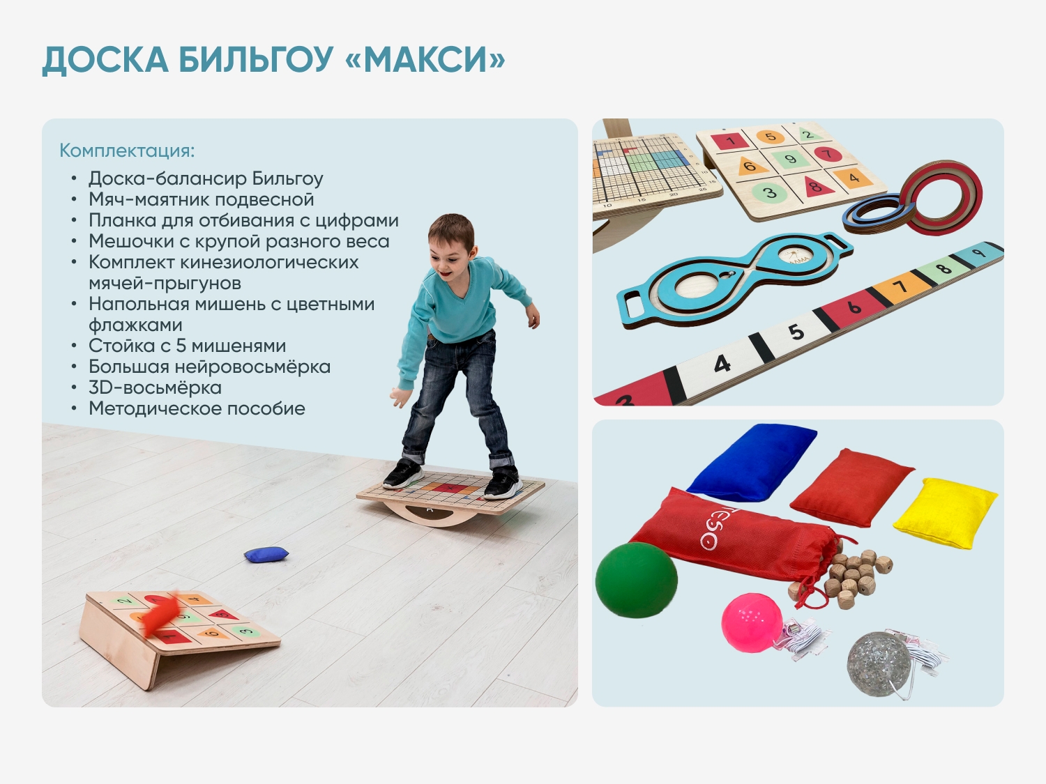 Комплект состоит из оригинальной доски Бильгоу с дополнительным инвентарем и тренажеров для развития мозга — нейровосьмерки и 3D-восьмерки. Он подходит для оборудования кабинета детского психолога, логопеда, физиотерапевта.