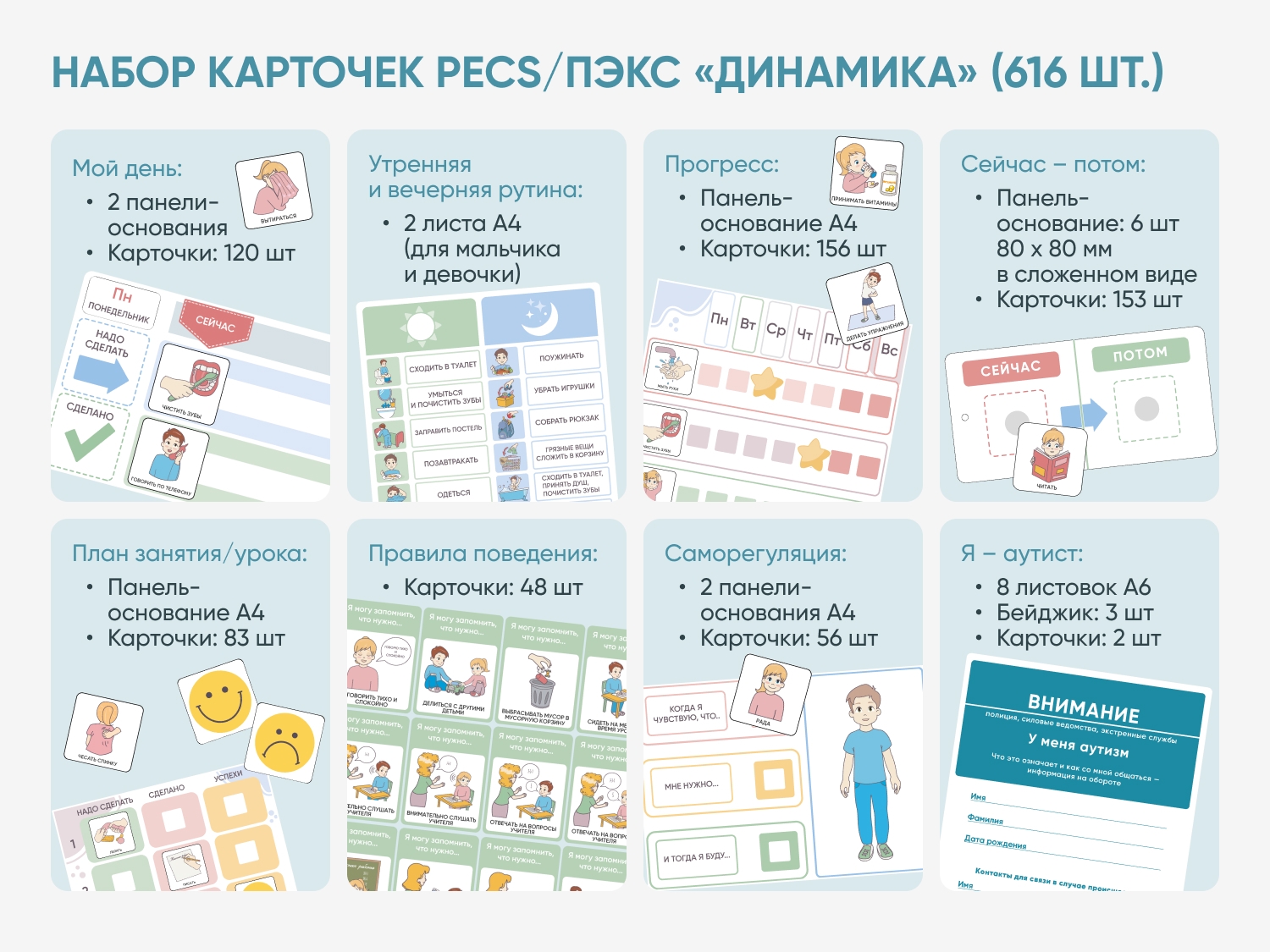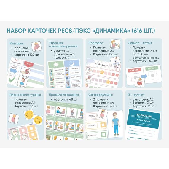 В комплектацию набора входят карточки ПЭКС и визуализации на разные тематики: