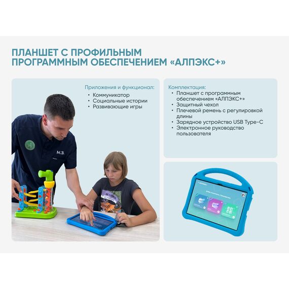 Планшет ориентируется на онтогенетические закономерности развития ребенка, учитывает структуру дефекта и адаптируется под индивидуальные особенности каждого пользователя.