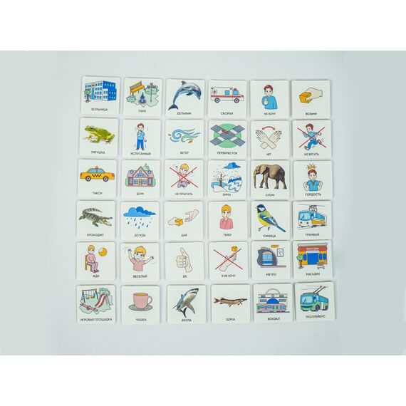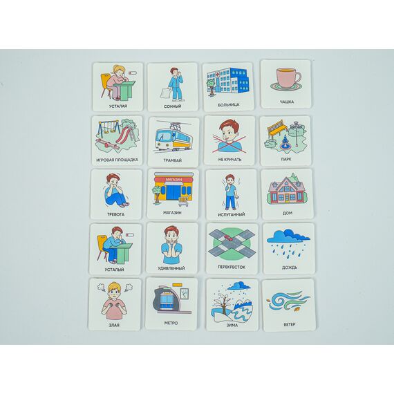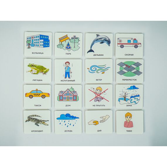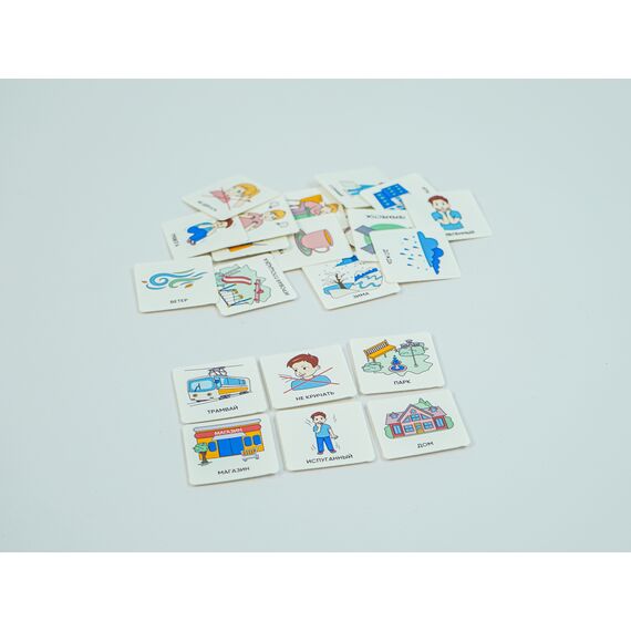 Карточки изготовлены из пластика полилит, он идеально гладкий и подходит для принтерной печати. Рисунки на карточках не стираются, их можно мыть и дезинфицировать, что особенно полезно при работе с особыми детьми. Продукция отвечает требованиям ФГОС ДО, СанПиН и критериям программы «Доступная среда».
