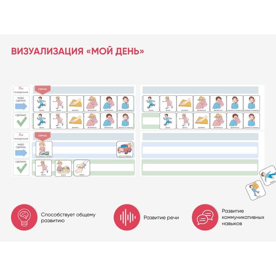 Визуализация для демонстрации последовательности событий в течении дня. Помогает снять напряжение, поддерживает мотивацию ребенка.