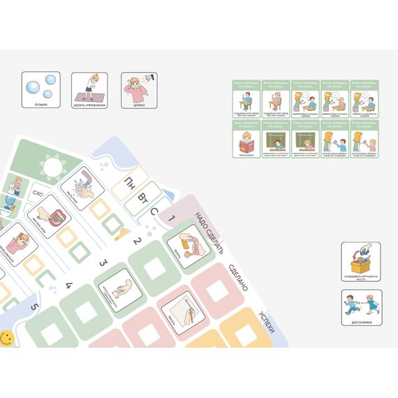Пособие для организации обучения ребенка ежедневным рутинам: чистить зубы, собирать игрушки, собирать портфель и другие. Помогает фиксировать успешность формирования новой привычки и поддерживает мотивацию ребенка. Карточки для мальчика и для девочки.