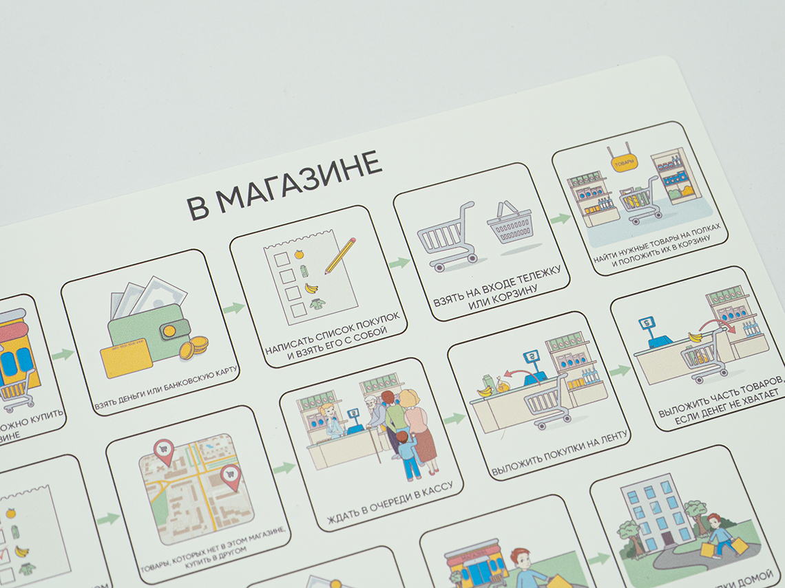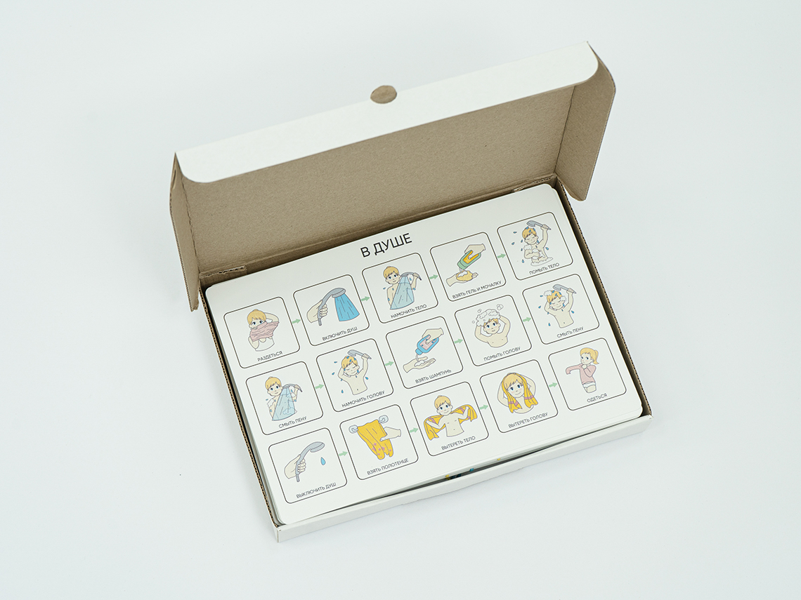 Комплект листов с картинками, позволяющими визуализировать для детей с РАС (ЗПР, УО, синдромом Дауна) последовательность ключевых событий в жизни и структурировать распорядок дня. Зрительное восприятие у детей с РАС развито лучше, чем аудиальное, поэтому визуальные опоры позволяют эффективно обучить ребёнка достижению целевого результата и убрать нежелательное поведение. Включает в себя модуль «сначала-потом», комплекты «Поведенческая цепочка», «Последовательность событий», «Таблицы выбора».