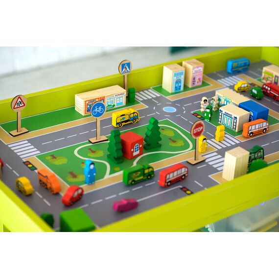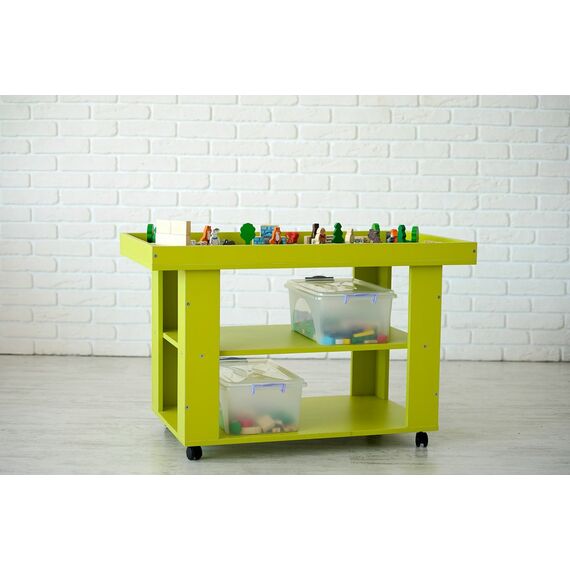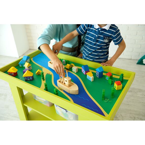 - Материал: Корпус стола - ЛДСП, Игрушки - массив натурального дерева (береза), Контейнеры - пластик, Поля - ПВХ