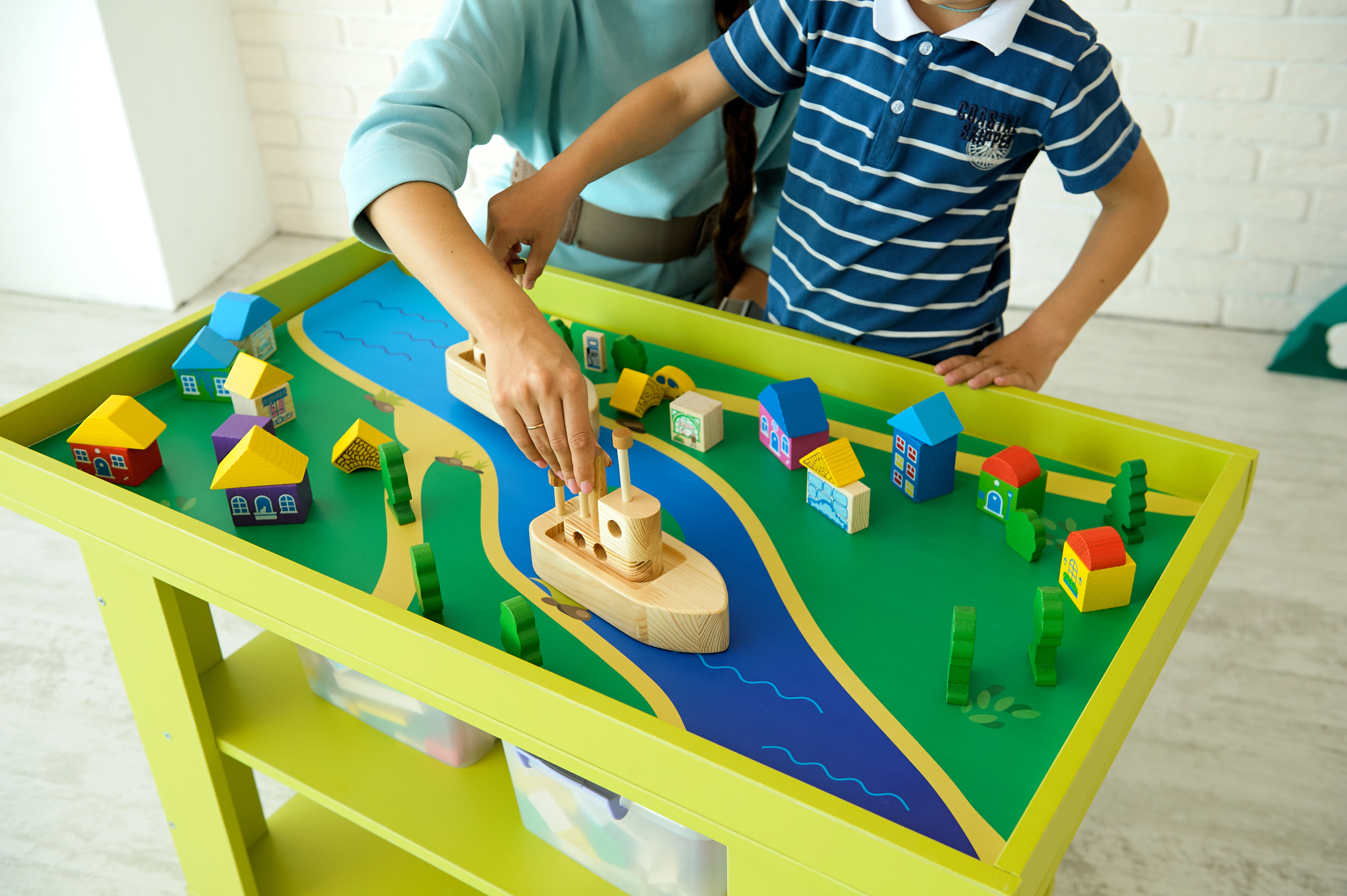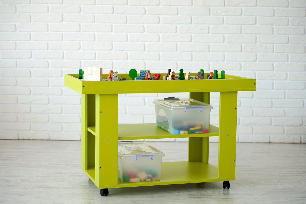 - Материал: Корпус стола - ЛДСП, Игрушки - массив натурального дерева (береза), Контейнеры - пластик, Поля - ПВХ